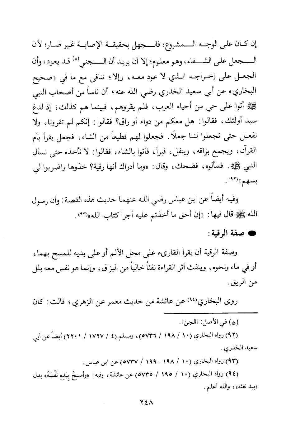 إن كان على الوجه المشروع " فالجهل بحقيقة الإصابة غير ضار؛ لأن الجعل على الشفاء، وهو معلوم " إلا أن يريد أن الجني (*) قد يعود، وأن الجعل على إخراجه الذي لا عود معه، وإلا، تنافى مع ما في " صحيح البخاري " عن أبي سعيد الخدري رضي الله عنه؛ أَنَّ نَاسًا مِنْ أَصْحَابِ النَّبِيِّ - صَلَّى اللهُ عَلَيْهِ وَسَلَّمَ - أَتَوْا عَلَى حَيٍّ مِنْ أَحْيَاءِ العَرَبِ، فَلَمْ يَقْرُوهُمْ، فَبَيْنَمَا هُمْ كَذَلِكَ، إِذْ لُدِغَ سَيِّدُ أُولَئِكَ، فَقَالُوا: هَلْ مَعَكُمْ مِنْ دَوَاءٍ أَوْ رَاقٍ؟ فَقَالُوا: إِنَّكُمْ لَمْ تَقْرُونَا، وَلاَ نَفْعَلُ حَتَّى تَجْعَلُوا لَنَا جُعْلًا. فَجَعَلُوا لَهُمْ قَطِيعًا مِنَ الشَّاءِ، فَجَعَلَ يَقْرَأُ بِأُمِّ القُرْآنِ، وَيَجْمَعُ بُزَاقَهُ، وَيَتْفِلُ، فَبَرَأَ، فَأَتَوْا بِالشَّاءِ، فَقَالُوا: لاَ نَأْخُذُهُ حَتَّى نَسْأَلَ - النَّبِيَّ صَلَّى اللهُ عَلَيْهِ وَسَلَّمَ -، فَسَأَلُوهُ فَضَحِكَ وَقَالَ: «وَمَا أَدْرَاكَ أَنَّهَا رُقْيَةٌ؟ خُذُوهَا وَاضْرِبُوا لِي بِسَهْمٍ» (¬92).