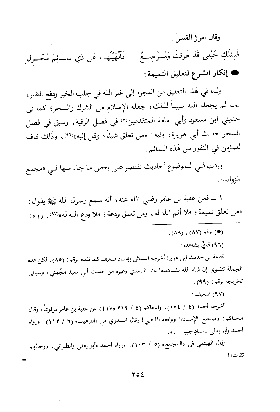1 - فعن عقبة بن عامر رضي الله عنه؛ أنه سمع رسول الله - صَلَّى اللهُ عَلَيْهِ وَسَلَّمَ - يقول: «مَنْ تَعَلَّقَ تَمِيمَةً، فَلَا أَتَمَّ اللَّهُ لَهُ، وَمَنْ تَعَلَّقَ وَدَعَةً، فَلَا وَدَعَ اللَّهُ لَهُ» (¬97). رواه: