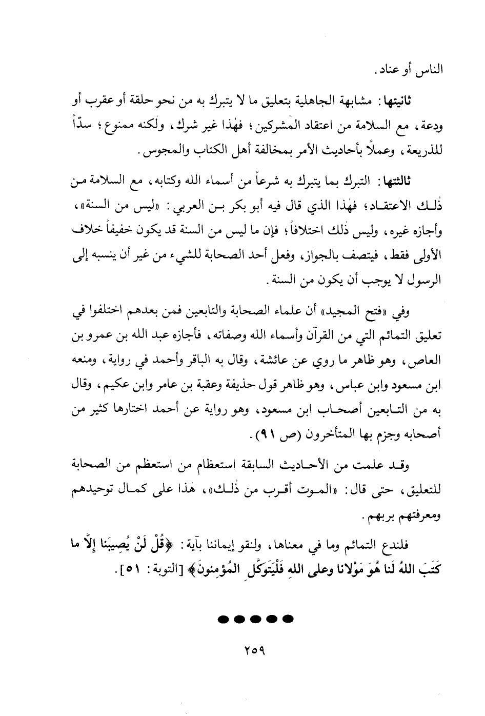 وفي " فتح المجيد " أن علماء الصحابة والتابعين فمن بعدهم اختلفوا في تعليق التمائم التي من القرآن وأسماء الله وصفاته، فأجازه عبد الله بن عمرو بن العاص، وهو ظاهر ما روي عن عائشة، وقال به الباقر وأحمد في رواية، ومنعه ابن مسعود وابن عباس، وهو ظاهر قول حذيفة وعقبة بن عامر وابن عكيم، وقال به من التابعين أصحاب ابن مسعود، وهو رواية عن أحمد اختارها كثير من أصحابه وجزم بها المتأخرون [ص:91].