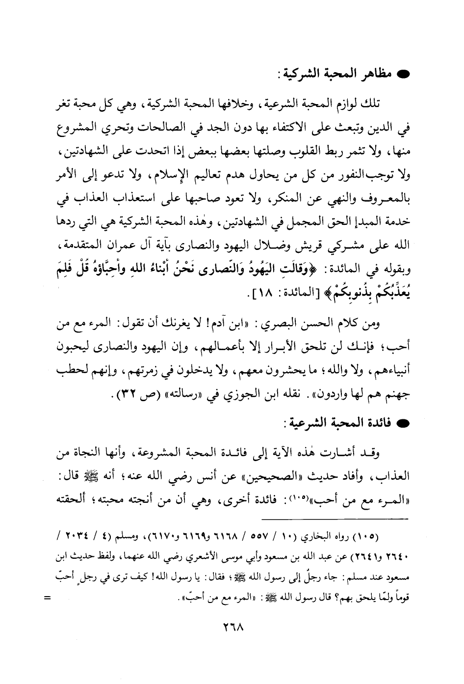 (105) رواه البخاري (10/ 557/ 6168 و6169 و6170)، ومسلم (4/ 2034/ 2640 و2641) عن عبد الله بن مسعود وأبي موسى الأشعري رضي الله عنهما، ولفظ حديث ابن مسعود عند مسلم: جاء رجلٌ إلى رسول الله - صَلَّى اللهُ عَلَيْهِ وَسَلَّمَ -؛ فقال: يارسول الله! كيف ترى في رجل أحبّ قوماً ولمّا يلحق بهم؛ قال رسول الله - صَلَّى اللهُ عَلَيْهِ وَسَلَّمَ -: «الْمَرْءُ مَعَ مَنْ أَحَبَّ».
