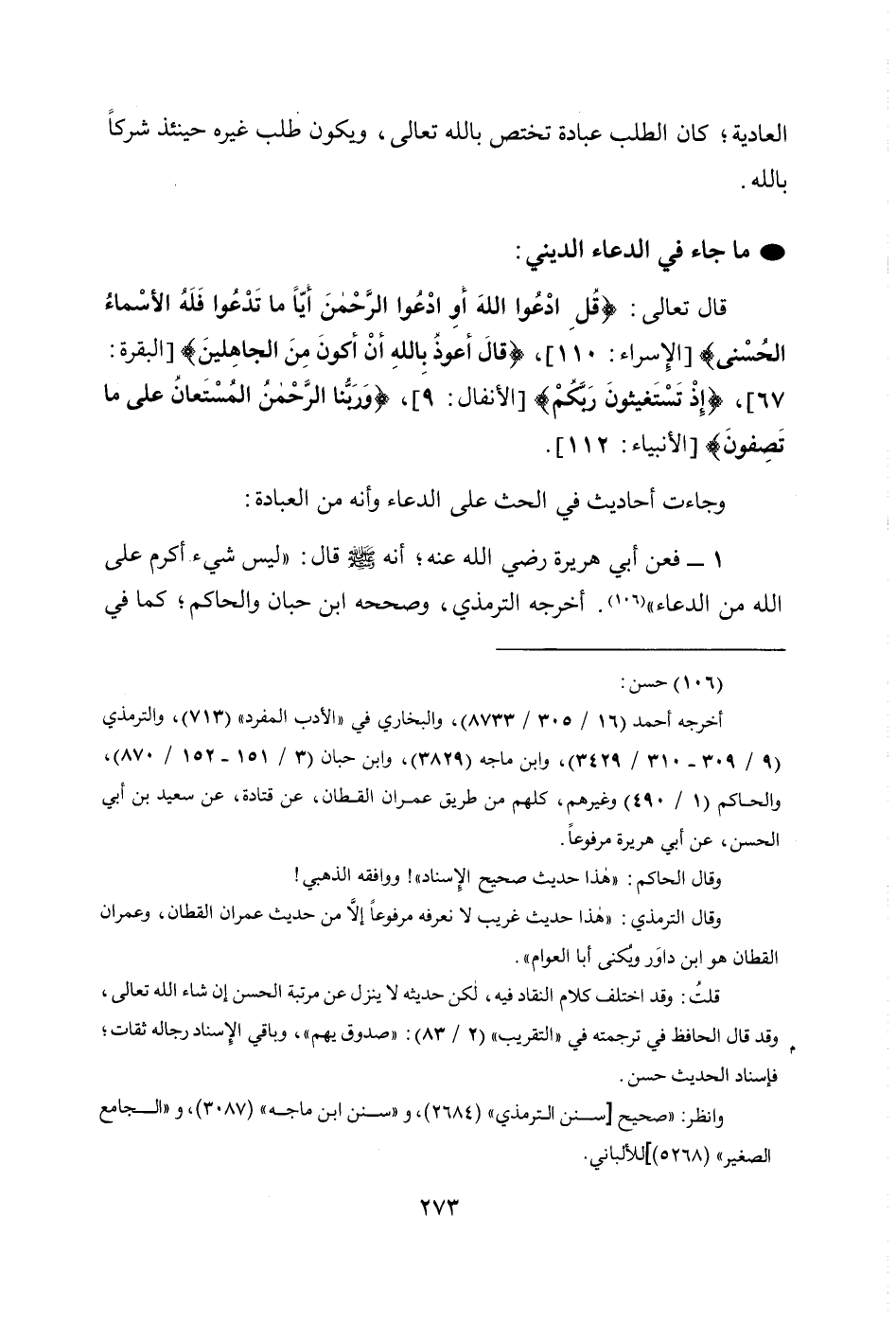 1 - فعن أبي هريرة رضي الله عنه؛ أنه - صَلَّى اللهُ عَلَيْهِ وَسَلَّمَ - قال: «لَيْسَ شَيْءٌ أَكْرَمَ عَلَى اللَّهِ مِنَ الدُّعَاءِ» (106). أخرجه الترمذي، وصححه ابن حبان والحاكم، كما في