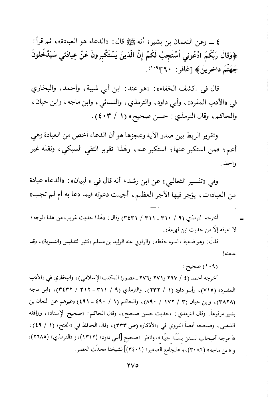 4 - وعن النعمان بن بشير؛ أنه - صَلَّى اللهُ عَلَيْهِ وَسَلَّمَ - قال: «الدُّعَاءُ هُوَ الْعِبَادَةُ»، ثم قرأ: {وَقَالَ رَبُّكُمُ ادْعُونِي أَسْتَجِبْ لَكُمْ إِنَّ الَّذِينَ يَسْتَكْبِرُونَ عَنْ عِبَادَتِي سَيَدْخُلُونَ جَهَنَّمَ دَاخِرِينَ} [غافر: 65] (109).
