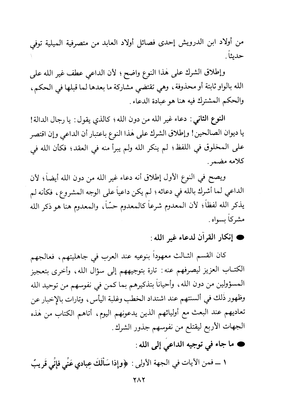وإطلاق الشرك على هذا النوع واضح؛ لأن الداعي عطف غير الله على الله بالواو ثابتة أو محذوفة، وهي تقتضي مشاركة ما بعدها لما قبلها في الحكم، والحكم المشترك فيه هنا هو عبادة الدعاء.