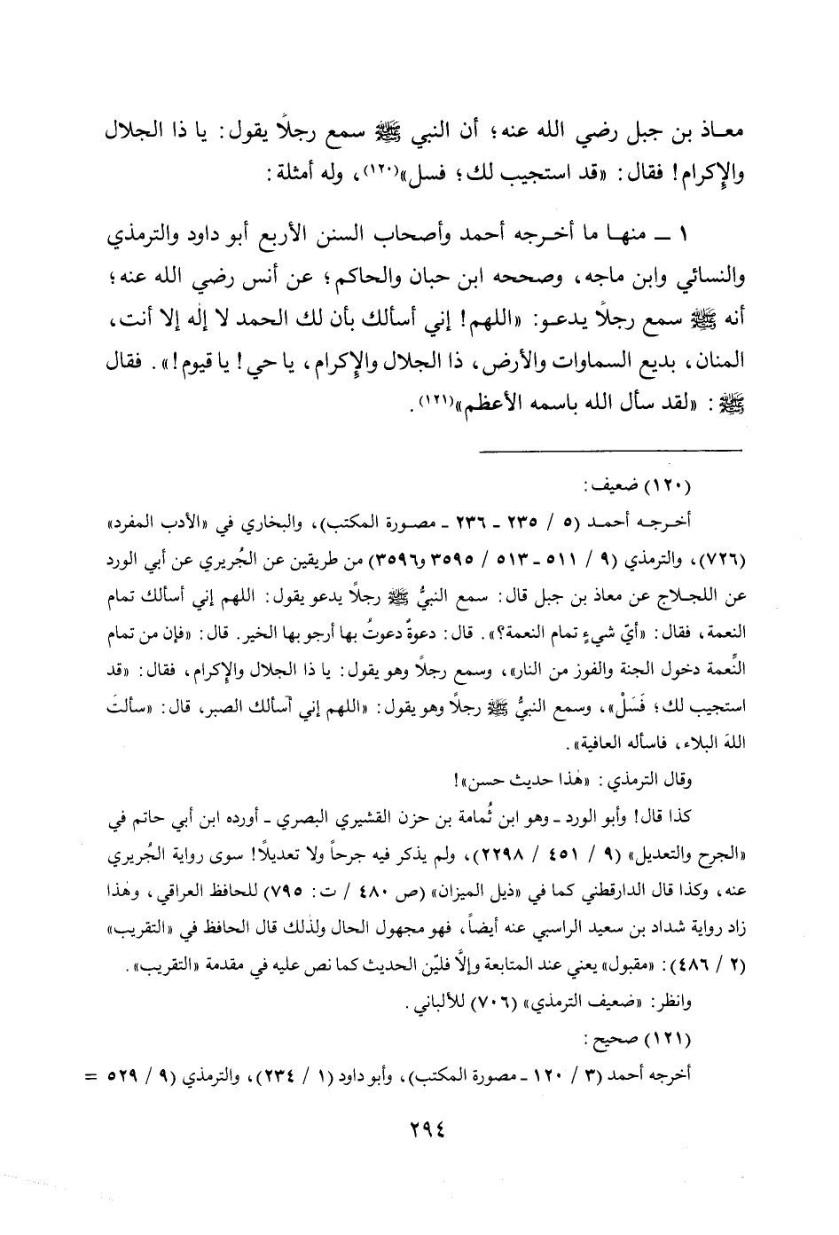 (120) ضعيف: أخرجه أحمد (5/ 235 - 236 - مصورة المكتب)، والبخاري في " الأدب المفرد " (726)، والترمذي (9/ 511 - 513/ 3595 و3596) من طريقين عن الجُريري عن أبي الورد عن اللجلاج عن معاذ بن جبل قَالَ: سَمِعَ النَّبِيّ - صَلَّى اللَّهُ عَلَيْهِ وَسَلَّمَ - رَجُلًا يَدْعُو يَقُولُ: اللَّهُمَّ إِنِّي أَسْأَلُكَ تَمَامَ النِّعْمَةِ، فَقَالَ: «أَيُّ شَيْءٍ تَمَامُ النِّعْمَةِ؟». قَالَ: دَعْوَةٌ دَعَوْتُ بِهَا أَرْجُو بِهَا الخَيْرَ. قَالَ: «فَإِنَّ مِنْ تَمَامِ النِّعْمَةِ دُخُولَ الجَنَّةِ وَالفَوْزَ مِنَ النَّارِ»، وَسَمِعَ رَجُلًا وَهُوَ يَقُولُ: يَا ذَا الْجَلَالِ وَالْإِكْرَامِ، فَقَالَ: «قَدْ اسْتُجِيبَ لَكَ؛ فَسَلْ»، وَسَمِعَ النَّبِيُّ - صَلَّى اللهُ عَلَيْهِ وَسَلَّمَ - رَجُلًا وَهُوَ يَقُولُ: اللَّهُمَّ إِنِّي أَسْأَلُكَ الصَّبْرَ فَقَالَ: «سَأَلْتَ اللَّهَ الْبَلَاءَ، فَاسْأَلْهُ الْعَافِيَةَ».