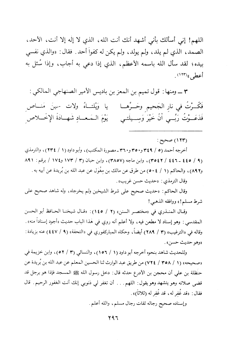 اللَّهُمَّ! إِنِّي أَسْأَلُكَ بِأَنِّي أَشْهَدُ أَنَّكَ أَنْتَ اللَّهُ، الَّذِي لَا إِلَهَ إِلَّا أَنْتَ، الْأَحَدُ الصَّمَدُ، الَّذِي لَمْ يَلِدْ، وَلَمْ يُولَدْ، وَلَمْ يَكُنْ لَهُ كُفُوًا أَحَدٌ. فَقَالَ: «وَالَّذِي نَفْسِي بِيَدِهِ، لَقَدْ سَأَلَ اللَّهَ بِاسْمِهِ الْأَعْظَمِ، الَّذِي إِذَا دُعِيَ أَجَابَ، وَإِذَا سُئِلَ بِهِ أَعْطَى» (123).