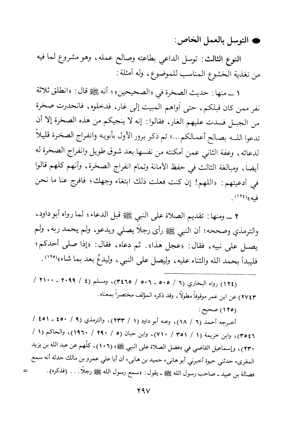 1 - منها: حديث الصخرة في " الصحيحين "؛ أَنَّهُ - صَلَّى اللهُ عَلَيْهِ وَسَلَّمَ - قَالَ: «انْطَلَقَ ثَلاَثَةُ نَفَرٍ مِمَّنْ كَانَ قَبْلَكُمْ، حَتَّى آوَاهُمُ الْمَبِيتُ إِلَى غَارٍ، فَدَخَلُوهُ، فَانْحَدَرَتْ صَخْرَةٌ مِنَ الْجَبَل فَسَدَّتْ عَلَيْهِمُ الْغَارَ، فَقَالُوا: إِنَّهُ لاَ يُنْجِيكُمْ مِنْ هَذِهِ الصَّخْرَةِ إِلاَّ أَنْ تَدْعُوا اللَّهَ بِصَالِحِ أَعْمَالِكُ ... » ثم ذكر برور الأول بأبويه وانفراج الصخرة قليلاً لدعائه، وعفة الثاني عمن أمكنته من نفسها بعد شوق طويل وانفراج الصخرة له أيضاً، ومبالغة الثالث في حفظ الأمانة وتمام انفراج الصخرة، وأنهم كلهم قالوا في أدعيتهم: «اللَّهُمَّ! إِنْ كُنْتُ فَعَلْتُ ذَلِكَ ابْتِغَاءَ وَجْهِكَ؛ فَافْرِجْ عَنَّا مَا نَحْنُ فِيهِ» (124)