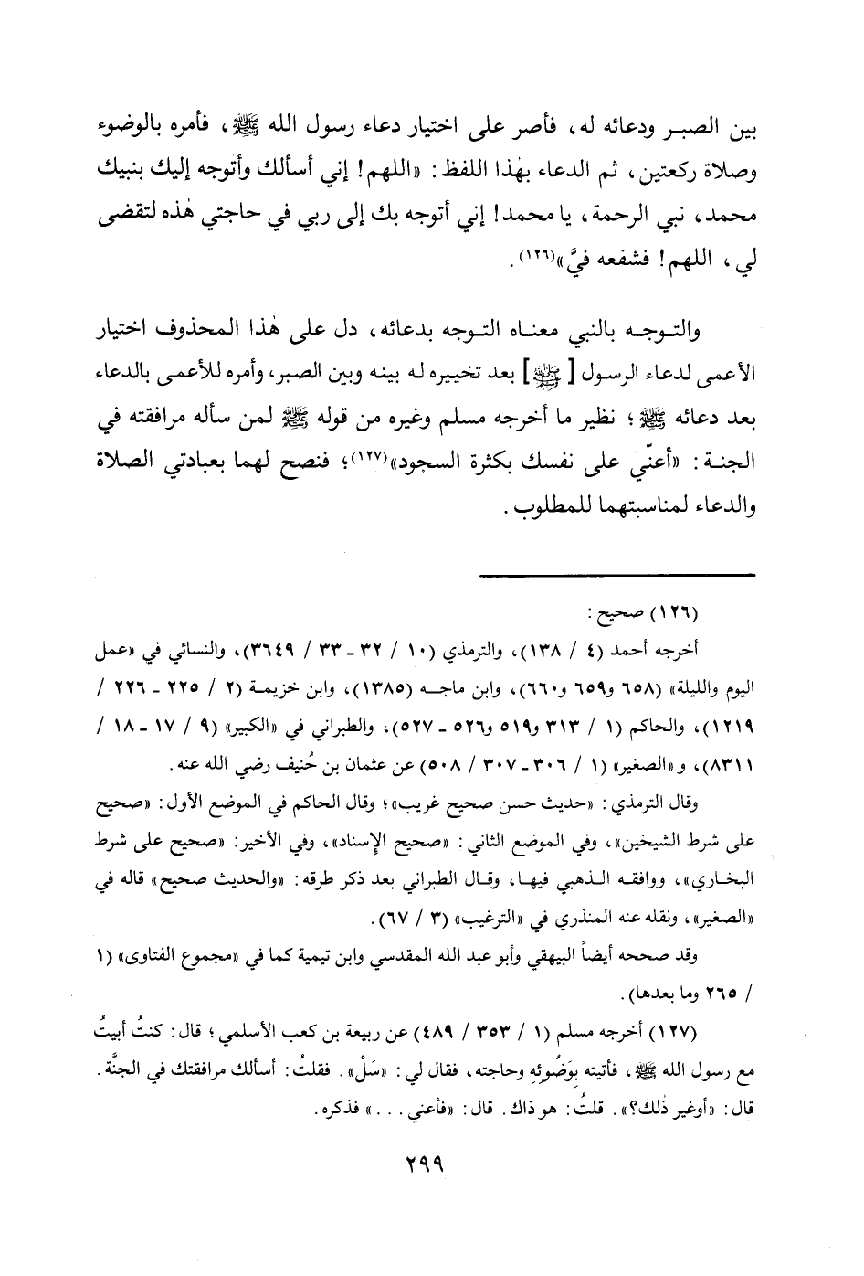 والتوجه بالنبي معناه التوجه بدعائه، دل على هذا المحذوف اختيار الأعمى لدعاء الرسول [- صَلَّى اللهُ عَلَيْهِ وَسَلَّمَ -] بعد تخييره له بينه وبين الصبر، وأمره للأعمى بالدعاء بعد دعائه - صَلَّى اللهُ عَلَيْهِ وَسَلَّمَ -؛ نظير ما أخرجه مسلم وغيره من قوله - صَلَّى اللهُ عَلَيْهِ وَسَلَّمَ - لمن سأله مرافقته في الجنة: «أَعِنِّي عَلَى نَفْسِكَ بِكَثْرَةِ السُّجُودِ» (127)؛ فنصح لهما بعبادتي الصلاة والدعاء لمناسبتهما للمطلوب.