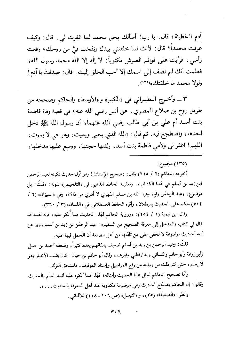 (135) موضوع: أخرجه الحاكم (2/ 615) وقال: " صحيح الإِسناد!! وهو أوَّل حديث ذكرته لعبد الرحمن ابن زيد بن أسلم في هذا الكتاب ". وتعقبه الحافظ الذهبي في " التلخيص " بقوله: " قلتُ: بل موضوع، وعبد الرحمن واهٍ، وعبد الله بن مسلم الفهري لا أدري من ذا؟ "، وفي " الميزان " (2/ 504) حكم على الحديث بالبطلان، وأقره الحافظ العسقلاني في " اللسان " (3/ 360).