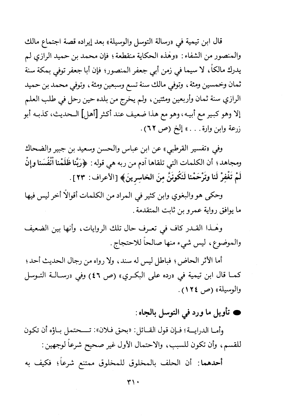 قال ابن تيمية في " رسالة التوسل والوسيلة " بعد إيراده قصة اجتماع مالك والمنصور من الشفاء: " وهذه الحكاية منقطعة؛ فإن محمد بن حميد الرازي لم يدرك مالكاً، لا سيما في زمن أبي جعفر المنصور؛ فإن أبا جعفر توفي بمكة سنة ثمان وخمسين ومئة، وتوفي مالك سنة تسع وسبعين ومئة، وتوفي محمد بن حميد الرازي سنة ثمان وأربعين ومئتين، ولم يخرج من بلده حين رحل في طلب العلم إلا وهو كبير مع أبيه، وهو مع هذا ضعيف عند أكثر [أهل] الحديث، كذبه أبو زرعة وابن وارة ... " إلخ [ص:62].