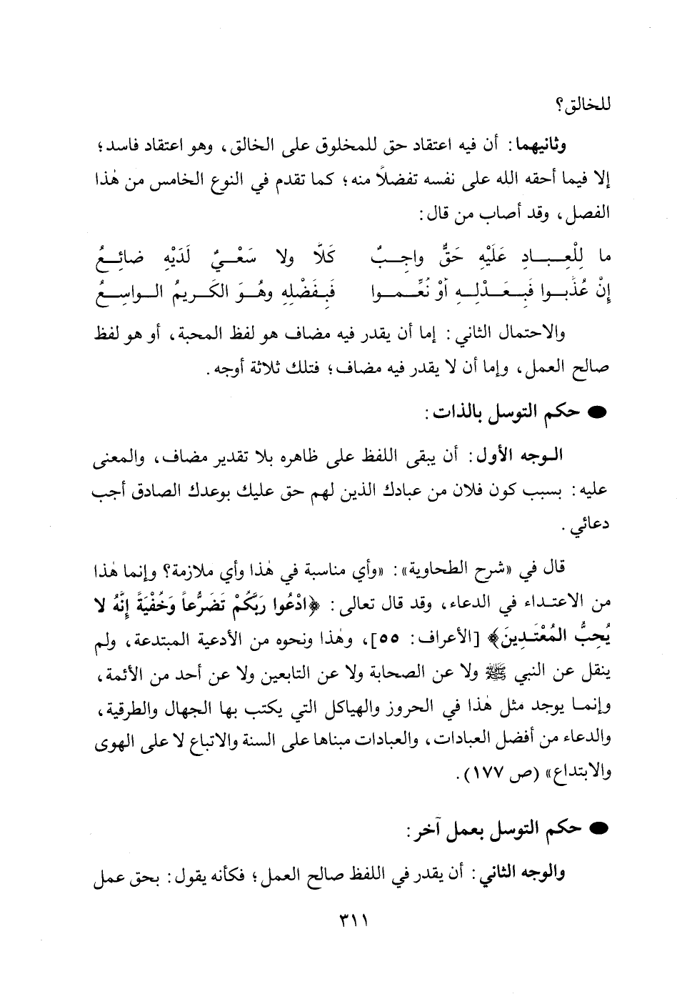 وثانيهما: أن فيه اعتقاد حق للمخلوق على الخالق، وهو اعتقاد فاسد؛ إلا فيما أحقه الله على نفسه تفضلاً منه؛ كما تقدم في النوع الخامس من هذا الفصل، وقد أصاب من قال:
