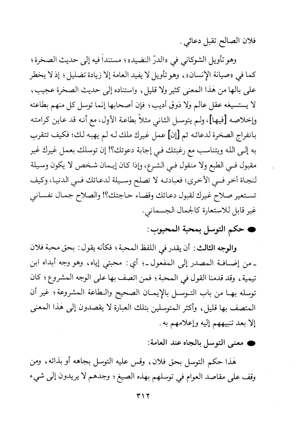 وهو تأويل الشوكاني في " الدرّ النضيد "؛ مستنداً فيه إلى حديث الصخرة، كما في " صيانة الإِنسان "، وهو تأويل لا يفيد العامة إلا زيادة تضليل، إذ لا يخطر على بالها من هذا المعنى كثير ولا قليل، واستناده إلى حديث الصخرة عجيب، لا يستسيغه عقل عالم ولا ذوق أديب، فإن أصحابها إنما توسل كل منهم بطاعته وإخلاصه [فيها]، ولم يتوسل الثاني مثلاً بطاعة الأول، مع أنه قد عاين كرامته بانفراج الصخرة لدعائه ثم [إن] عمل غيرك ملك له لم يهبه لك؛ فكيف تتقرب به إلى الله ويتناسب مع رغبتك في إجابة دعوتك؟! إن توسلك بعمل غيرك غير مقبول في الطبع ولا منقول في الشرع، وإذا كان إيمان شخص لا يكون وسيلة لنجاة آخر في الأخرى؛ فعبادته لا تصلح وسيلة لدعائك في الدنيا، وكيف تستعير صلاح غيرك لقبول دعائك وقضاء حاجتك؟! والصلاح جمال نفساني غير قابل للاستعارة كالجمال الجسماني.