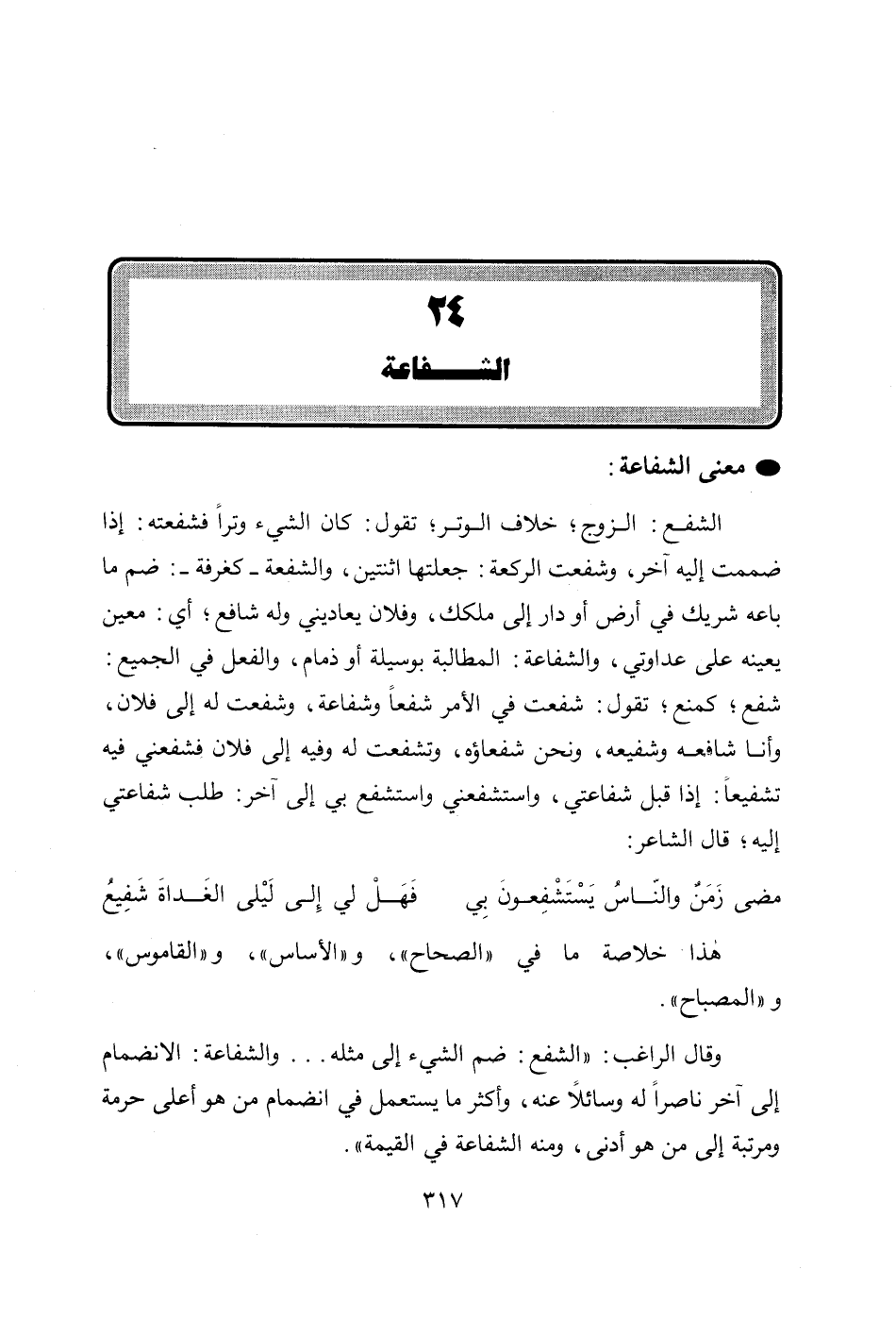 وقال الراغب: " الشفع: ضم الشيء إلى مثله ... والشفاعة: الانضمام إلى آخر ناصراً له وسائلاً عنه، وأكثر ما يستعمل في انضمام من هو أعلى حرمة ومرتبة إلى من هو أدنى، ومنه الشفاعة في القيمة ".