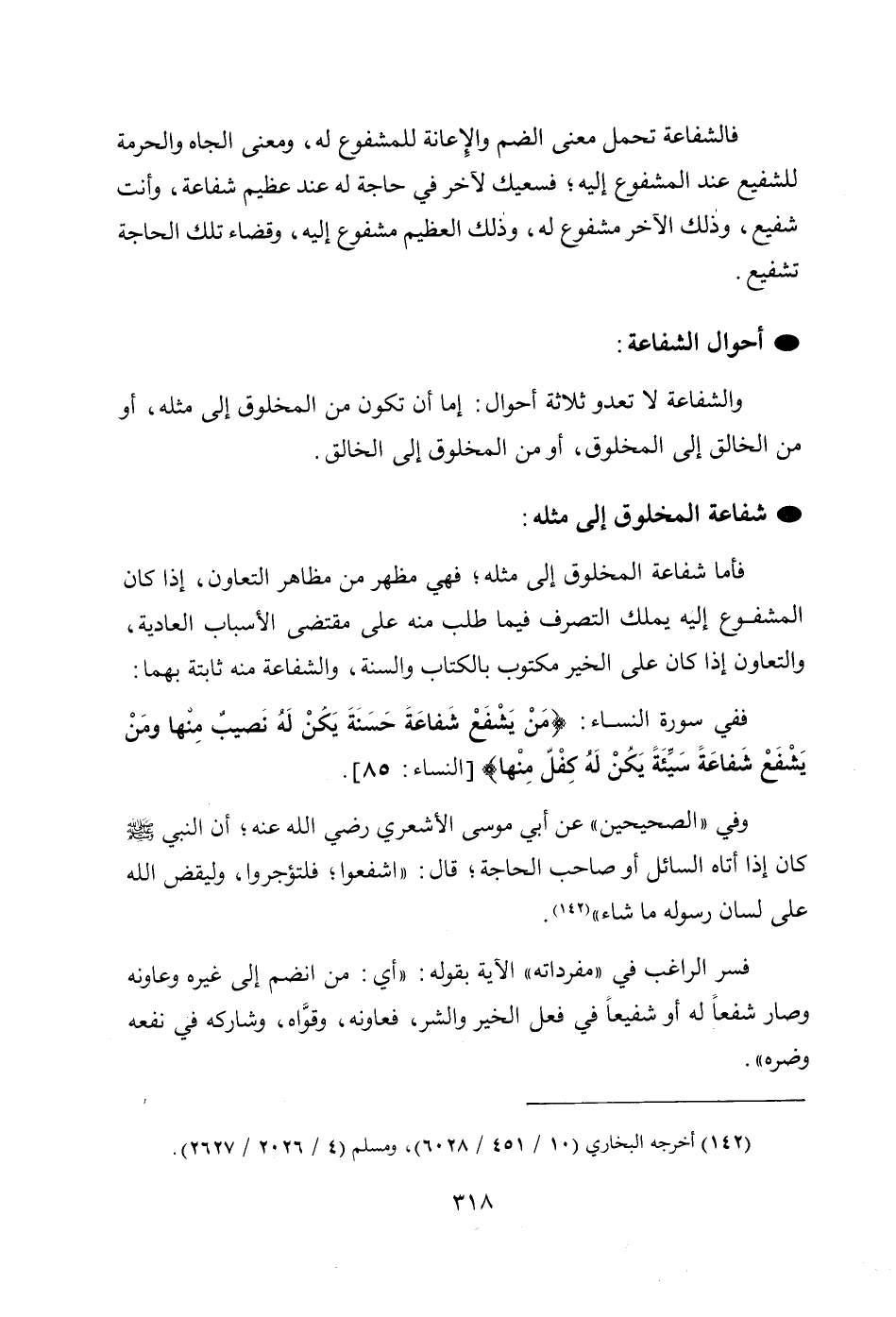 والشفاعة لا تعدو ثلاثة أحوال: إما أن تكون من المخلوق إلى مثله، أو من الخالق إلى المخلوق، أو من المخلوق إلى الخالق.