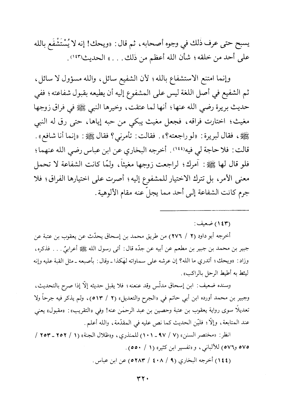 يُسَبِّحُ حَتَّى عُرِفَ ذَلِكَ فِي وُجُوهِ أَصْحَابِهِ، ثُمَّ قَالَ: «وَيْحَكَ! إِنَّهُ لَا يُسْتَشْفَعُ بِاللَّهِ عَلَى أَحَدٍ مِنْ خَلْقِهِ، شَأْنُ اللَّهِ أَعْظَمُ مِنْ ذَلِكَ ... " الحديث (143).