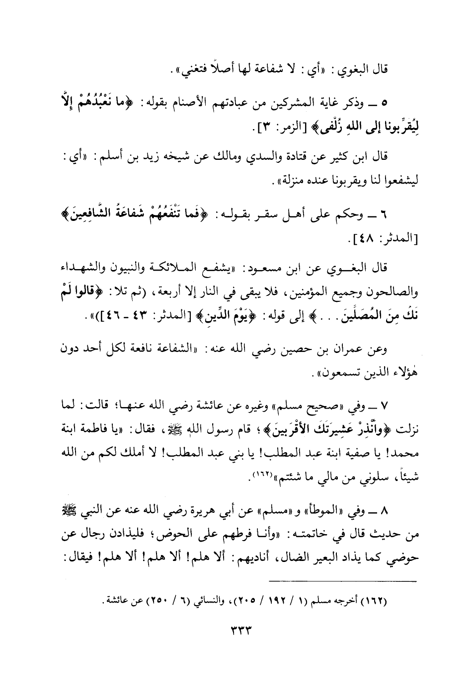 7 - وفي " صحيح مسلم " وغيره عن عائشة رضي الله عنها؛ قَالَتْ: لَمَّا نَزَلَتْ: {وَأَنْذِرْ عَشِيرَتَكَ الْأَقْرَبِينَ}؛ قَامَ رَسُولُ اللَّهِ - صَلَّى اللَّهُ عَلَيْهِ وَسَلَّمَ -، فَقَالَ: «يَا فَاطِمَةُ ابْنَةَ مُحَمَّدٍ! يَا صَفِيَّةُ ابْنَةَ عَبْدِ الْمُطَّلِبِ! يَا بَنِي عَبْدِ الْمُطَّلِبِ! لَا أَمْلِكُ لَكُمْ مِنَ اللَّهِ شَيْئًا، سَلُونِي مِنْ مَالِي مَا شِئْتُمْ» (162).