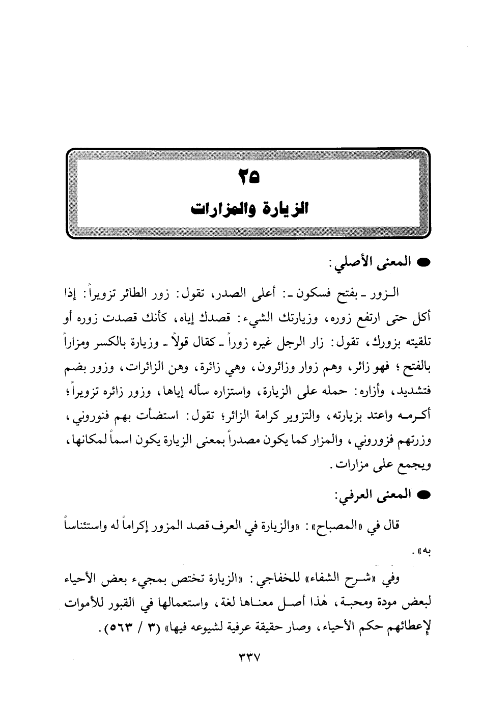وفي " شرح الشفاء " للخفاجي: " الزيارة تختص بمجيء بعض الأحياء لبعض مودة ومحبة، هذا أصل معناها لغة، واستعمالها في القبور للأموات لإِعطائهم حكم الأحياء، وصار حقيقة عرفية لشيوعه فيها " (3/ 563).