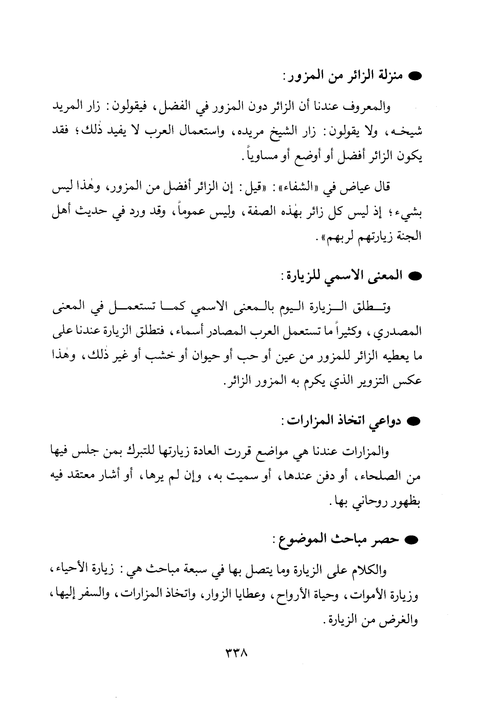 والكلام على الزيارة وما يتصل بها في سبعة مباحث هي: زيارة الأحياء، وزيارة الأموات، وحياة الأرواح، وعطايا الزوار، واتخاذ المزارات، والسفر إليها، والغرض من الزيارة.