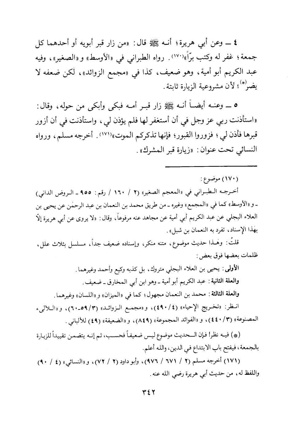 4 - وعن أبي هريرة، أنه - صلى الله عليه وسلم - قال: «مَنْ زَارَ قَبْرَ أَبَوَيْهِ أَوْ أَحَدِهِمَا فِي كُلِّ جُمُعَةٍ؛ غُفِرَ لَهُ وَكُتِبَ بَرًّا» (170). رواه الطبراني في " الأوسط " و " الصغير "، وفيه عبد الكريم أبو أمية، وهو ضعيف، كذا في " مجمع الزوائد "، لكن ضعفه لا يضر (*)؛ لأن مشروعية الزيارة ثابتة.