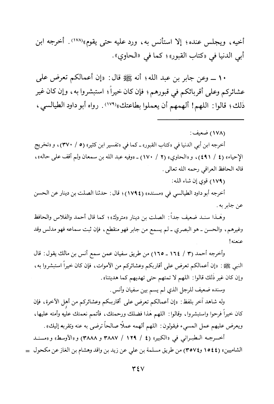 10 - وعن جابر بن عبد الله، أنه - صلى الله عليه وسلم - قال: «إِنَّ أَعْمَالَكُمْ تُعْرَضُ عَلَى عَشَائِرِكُمْ وَعَلَى أَقْرِبَائِكُمْ فِي قُبُورِهِمْ؛ فَإِنْ كَانَ خَيْرًا؛ اسْتَبْشَرُوا بِهِ، وَإِنْ كَانَ غَيْرَ ذَلِكَ؛ قَالُوا: اللَّهُمَّ! أَلْهِمْهُمْ أَنْ يَعْمَلُوا بِطَاعَتِكَ» (179). رواه أبو داود الطيالسي،