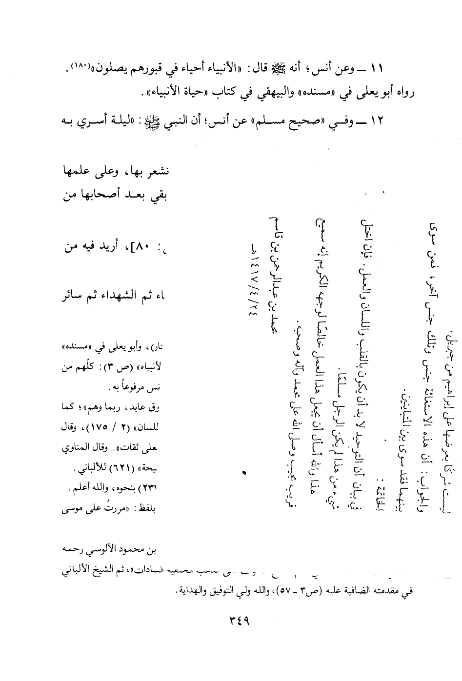 11 - وعن أنس؛ أنه - صَلَّى اللهُ عَلَيْهِ وَسَلَّمَ - قَالَ: «الأَنْبِياءُ أحْياءٌ فِي قُبُورِهِمْ يُصَلُّونَ» (180). رواه أبو يعلي في " مسنده " والبيهقي في كتاب " حياة الأنبياء ".