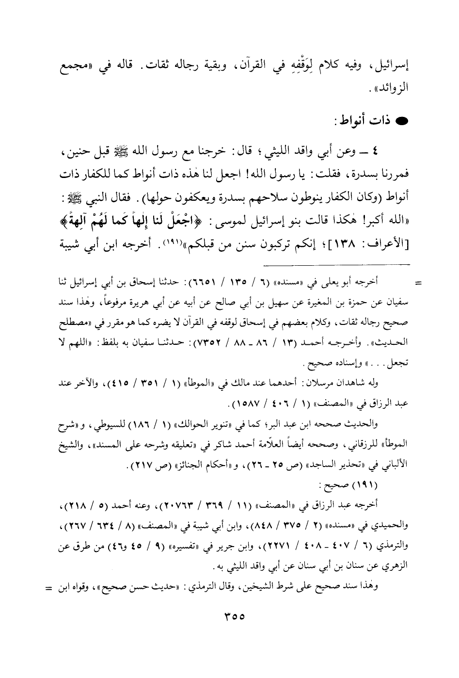 4 - وعن أبي واقد الليثي، قَالَ: خَرَجْنَا مَعَ رَسُولِ اللهِ - صَلَّى اللهُ عَلَيْهِ وَسَلَّمَ - قَبْلَ حُنَيْنٍ، فَمَرَرْنَا بِسِدْرَةٍ، فَقُلْتُ: يَا رَسُولَ اللهِ! اجْعَلْ لَنَا هَذِهِ ذَاتَ أَنْوَاطٍ كَمَا لِلْكُفَّارِ ذَاتُ أَنْوَاطٍ، (وَكَانَ الْكُفَّارُ يَنُوطُونَ سِلَاحَهُمْ بِسِدْرَةٍ وَيَعْكُفُونَ حَوْلَهَا). فَقَالَ النَّبِيُّ - صَلَّى اللهُ عَلَيْهِ وَسَلَّمَ -: «اللهُ أَكْبَرُ! هَكَذَا قَالَتْ بَنُو إِسْرَائِيلَ لِمُوسَى {اجْعَلْ لَنَا إِلَهًا كَمَا لَهُمْ آلِهَةً} [الأعراف: 138] إِنَّكُمْ تَرْكَبُونَ سَنَنَ مِنْ قَبْلِكُمْ» (191). أخرجه ابن أبي شيبة