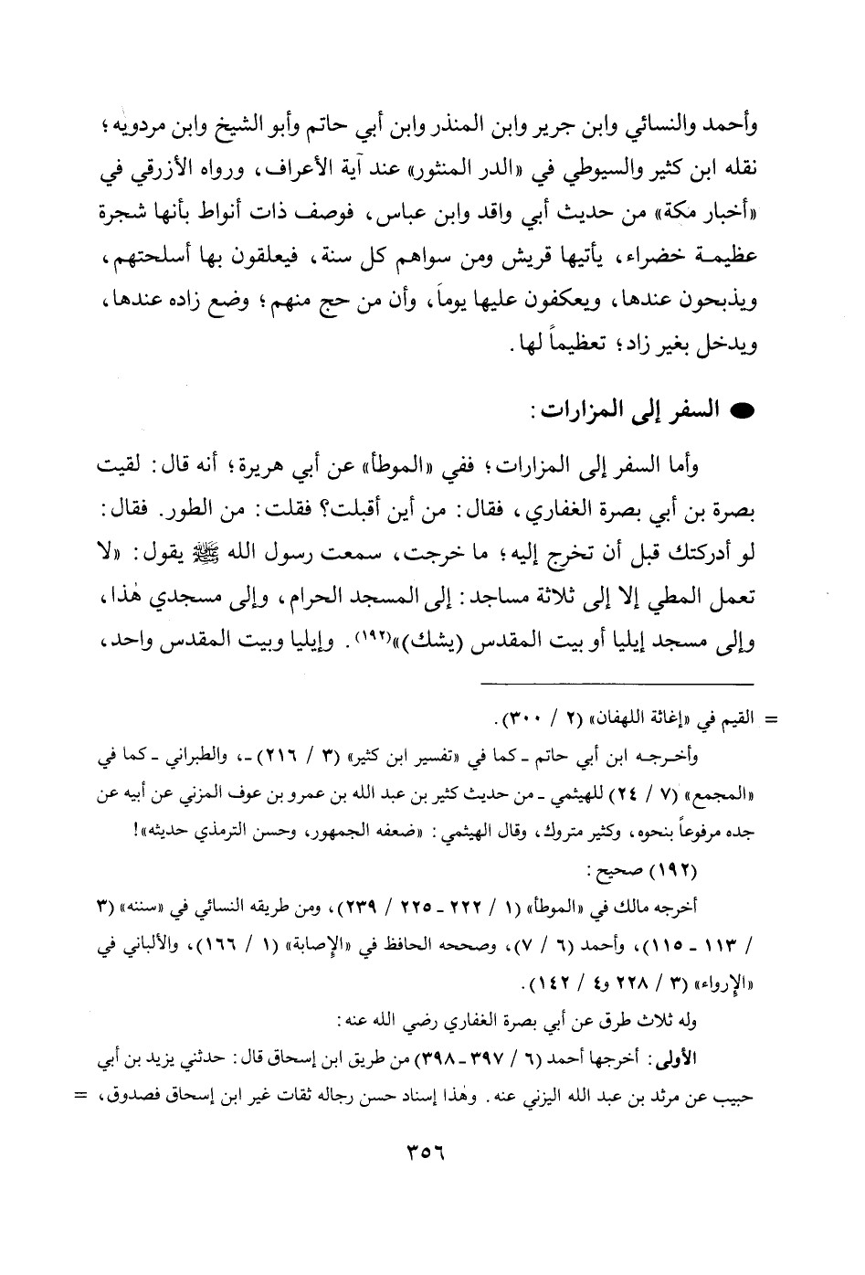 وأما السفر إلى المزارات؛ ففي " الموطأ " عن أبي هريرة؛ أنه قال: لقيت بصرة بن أبي بصرة الغفاري، فقال: من أين أقبلت؛ فقلت: من الطور. فقال: لو أدركتك قبل أن تخرج إليه؛ ما خرجت، سمعت رسول الله - صَلَّى اللهُ عَلَيْهِ وَسَلَّمَ - يقول: " «لَا تُعْمَلُ الْمَطِيُّ إِلَّا إِلَى ثَلَاثَةِ مَسَاجِدَ: الْمَسْجِدِ الْحَرَامِ، وَإِلَى مَسْجِدِي هَذَا، وَإِلَى مَسْجِدِ إِيلِيَّا أَوْ بَيْتِ الْمَقْدِسِ» (يَشُكُّ) " (192). وإيليا وبيت المقدس واحد،