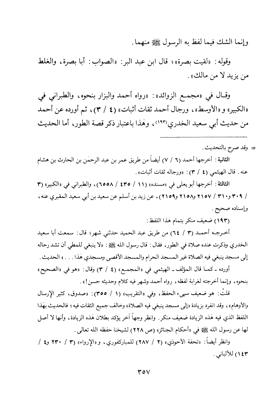 (193) ضعيف منكر بتمام هذا اللفظ: أخرجه أحمد (3/ 64) من طريق عبد الحميد حدثني شهر؛ قال: سمعت أبا سعيد الخدري وذكرت عنده صلاة في الطور، فقال: قال رسول الله - صلى الله عليه وسلم -: «لَا يَنْبَغِي لِلْمَطِيِّ أَنْ تُشَدَّ رِحَالُهُ إِلَى مَسْجِدٍ يُبْتَغَى فِيهِ الصَّلَاةُ، غَيْرَ الْمَسْجِدِ الْحَرَامِ، وَالْمَسْجِدِ الْأَقْصَى، وَمَسْجِدِي هَذَا ... » الحديث.