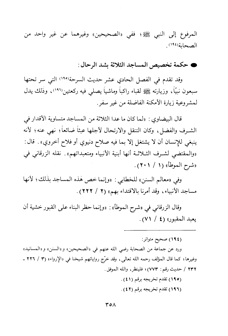 وقد تقدم في الفصل الحادي عشر حديث السرحة (195) التي سر تحتها سبعون نبيّاً، وزيارته - صلى الله عليه وسلم - لقباء راكباً وماشياً يصلي فيه ركعتين (196)، وذلك يدل لمشروعية زيارة الأمكنة الفاضلة من غير سفر.