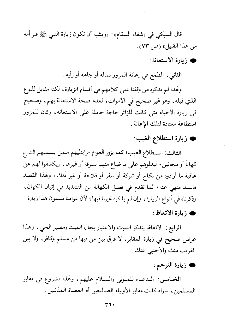 وهذا لم يذكره من وقفنا على كلامهم في أقسام الزيارة، لكنه مقابل للنوع الذي قبله، وهو غير صحيح في الأموات، لعدم صحة الاستعانة بهم، وصحيح في زيارة الأحياء متى كانت للزائر حاجة حاملة على الاستعانة، وكان للمزور استطاعة معتادة لتلك الإِعانة.