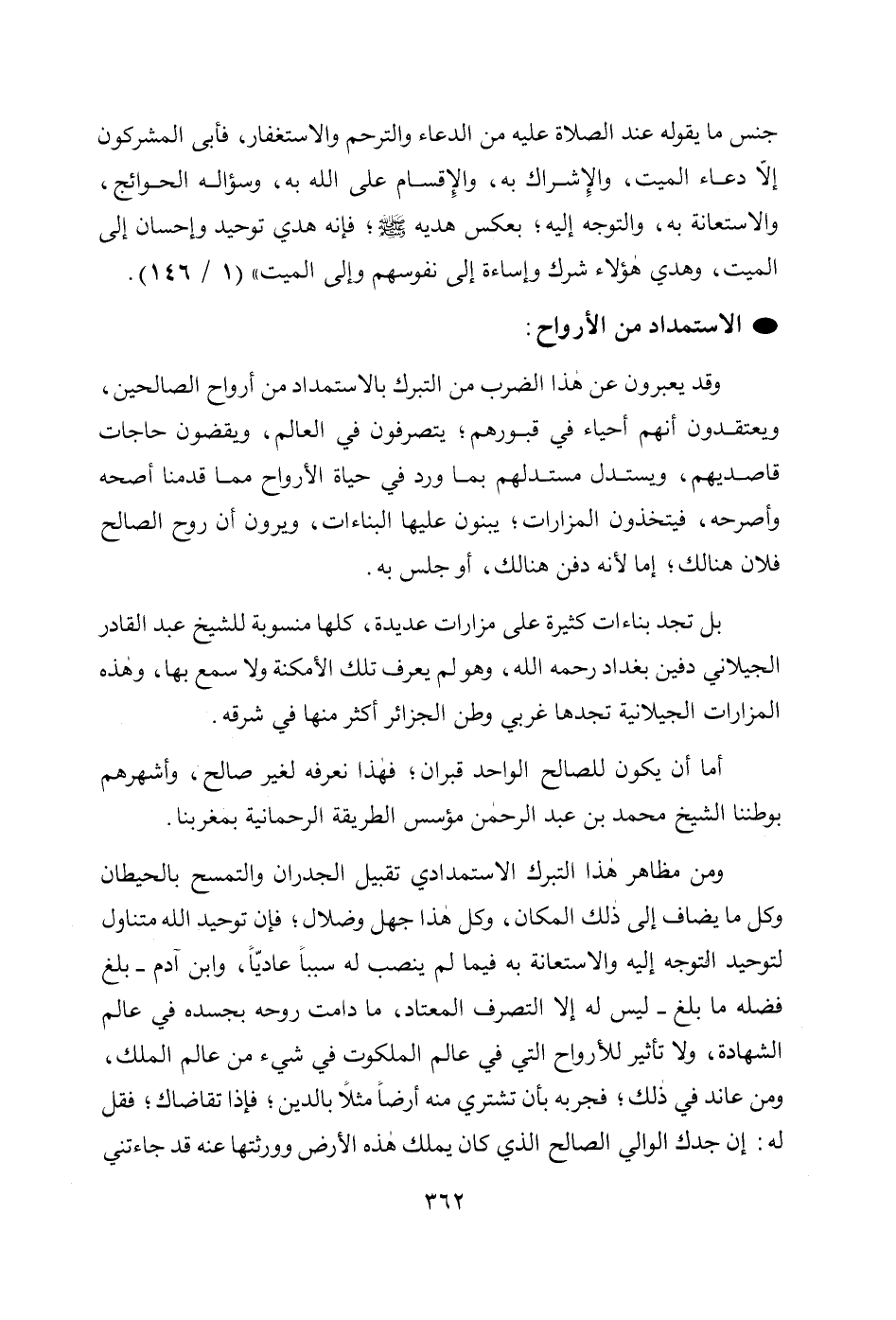 وقد يعبرون عن هذا الضرب من التبرك بالاستمداد من أرواح الصالحين، ويعتقدون أنهم أحياء في قبورهم؛ يتصرفون في العالم، ويقضون حاجات قاصديهم، ويستدل مستدلهم بما ورد في حياة الأرواح مما قدمنا أصحه وأصرحه، فيتخذون المزارات؛ يبنون عليها البناءات، ويرون أن روح الصالح فلان هنالك؛ إما لأنه دفن هنالك، أوجلس به.