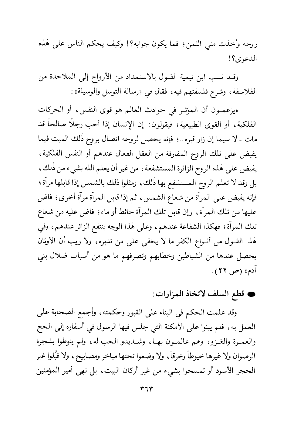 " يزعمون أن المؤثر في حوادث العالم هو قوى النفس، أو الحركات الفلكية، أو القوى الطبيعية؛ فيقولون: إن الإِنسان إذا أحب رجلًا صالحاً قد مات- لا سيما إن زار قبره-؛ فإنه يحصل لروحه اتصال بروح ذلك الميت فيما يفيض على تلك الروح المفارقة من العقل الفعال عندهم أو النفس الفلكية، يفيض على هذه الروح الزائرة المستشفعة، من غير أن يعلم الله بشيء من ذلك، بل وقد لا تعلم الروح المستشفع بها ذلك، ومثلوا ذلك بالشمس إذا قابلها مرآة، فإنه يفيض على المرآة من شعاع الشمس، ثم إذا قابل المرآة مرآة أخرى؛ فاض عليها من تلك المرآة، وإن قابل تلك المرآة حائط أو ماء؛ فاض عليه من شعاع تلك المرآة؛ فهكذا الشفاعة عندهم، وعلى هذا الوجه ينتفع الزائر عندهم، وشي هذا القول من أنواع الكفر ما لا يخفى على من تدبره، ولا ريب أن الأوثان يحصل عندها من الشياطين وخطابهم وتصرفهم ما هو من أسباب ضلال بني آدم " [ص:22].