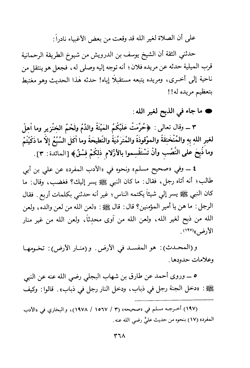 4 - وفي " صحيح مسلم " ونحوه في " الأدب المفرد " عن علي بن أبي طالب؛ أنه أتاه رجل، فقال: مَا كَانَ النَّبِيُّ - صَلَّى اللهُ عَلَيْهِ وَسَلَّمَ - يُسِرُّ إِلَيْكَ؟ فَغَضِبَ، وَقَالَ: مَا كَانَ النَّبِيُّ - صَلَّى اللَّهُ عَلَيْهِ وَسَلَّمَ - يُسِرُّ إِلَيَّ شَيْئًا يَكْتُمْهُ النَّاسَ، غَيْرَ أَنَّهُ حَدَّثَنِي بِكَلِمَاتٍ أَرْبَعٍ. فَقَالَ الرَّجُلُ: مَا هُنَّ يَا أَمِيرَ الْمُؤْمِنِينَ؟ قَالَ: قَالَ - صَلَّى اللهُ عَلَيْهِ وَسَلَّمَ -: «لَعَنَ اللَّهُ مَنْ لَعَنَ وَالِدَهُ، وَلَعَنَ اللَّهُ مَنْ ذَبَحَ لِغَيْرِ اللَّهِ، وَلَعَنَ اللَّهُ مَنْ آوَى مُحْدِثًا، وَلَعَنَ اللَّهُ مَنْ غَيَّرَ مَنَارَ الْأَرْضِ» (197).