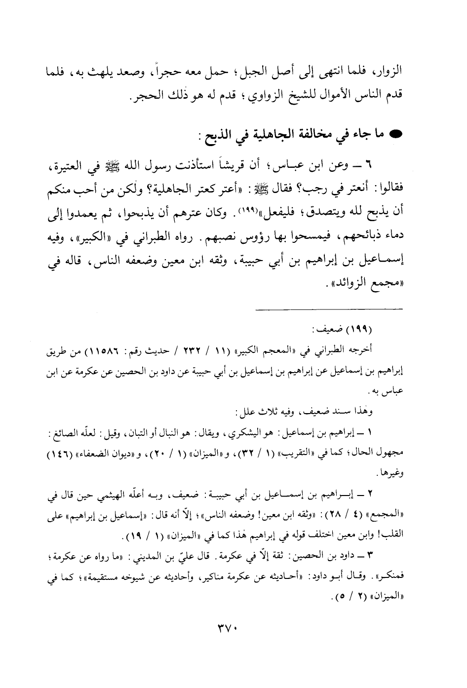 6 - وعن ابن عباس، أَنَّ قُرَيْشاً اسْتَأْذَنَتْ رَسُولَ اللهِ - صَلَّى اللهُ عَلَيْهِ وَسَلَّمَ - فِي الْعَتِيرَةِ، فَقَالُوا: أَنَعْتِرُ فِي رَجَبٍ؛ فَقَالَ - صَلَّى اللهُ عَلَيْهِ وَسَلَّمَ -: «أَعِتْرٌ كَعِتْرِ الْجَاهِلِيَّةِ؟ وَلَكِنْ مَنْ أَحَبَّ مِنْكُمْ أَنْ يَذْبَحَ لِلَّهِ وَيَتَصَدَّقَ؛ فَلْيَفْعَلْ» (199). وكان عترهم أن يذبحوا، ثم يعمدوا إلى دماء ذبائحهم، فيمسحوا بها رؤوس نصبهم. رواه الطبراني في " الكبير "، وفيه إسماعيل بن إبراهيم بن أبي حبيبة، وثقه ابن معين وضعفه الناس، قاله في " مجمع الزوائد ".