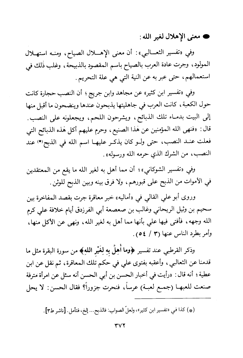 وفي " تفسير الثعالبي ": أن معنى الإِهلال الصياح، ومنه استهلال المولود، وجرت عادة العرب بالصياح باسم المقصود بالذبيحة، وغلب ذلك في استعمالهم، حتى عبر به عن النية التي هي علة التحريم.