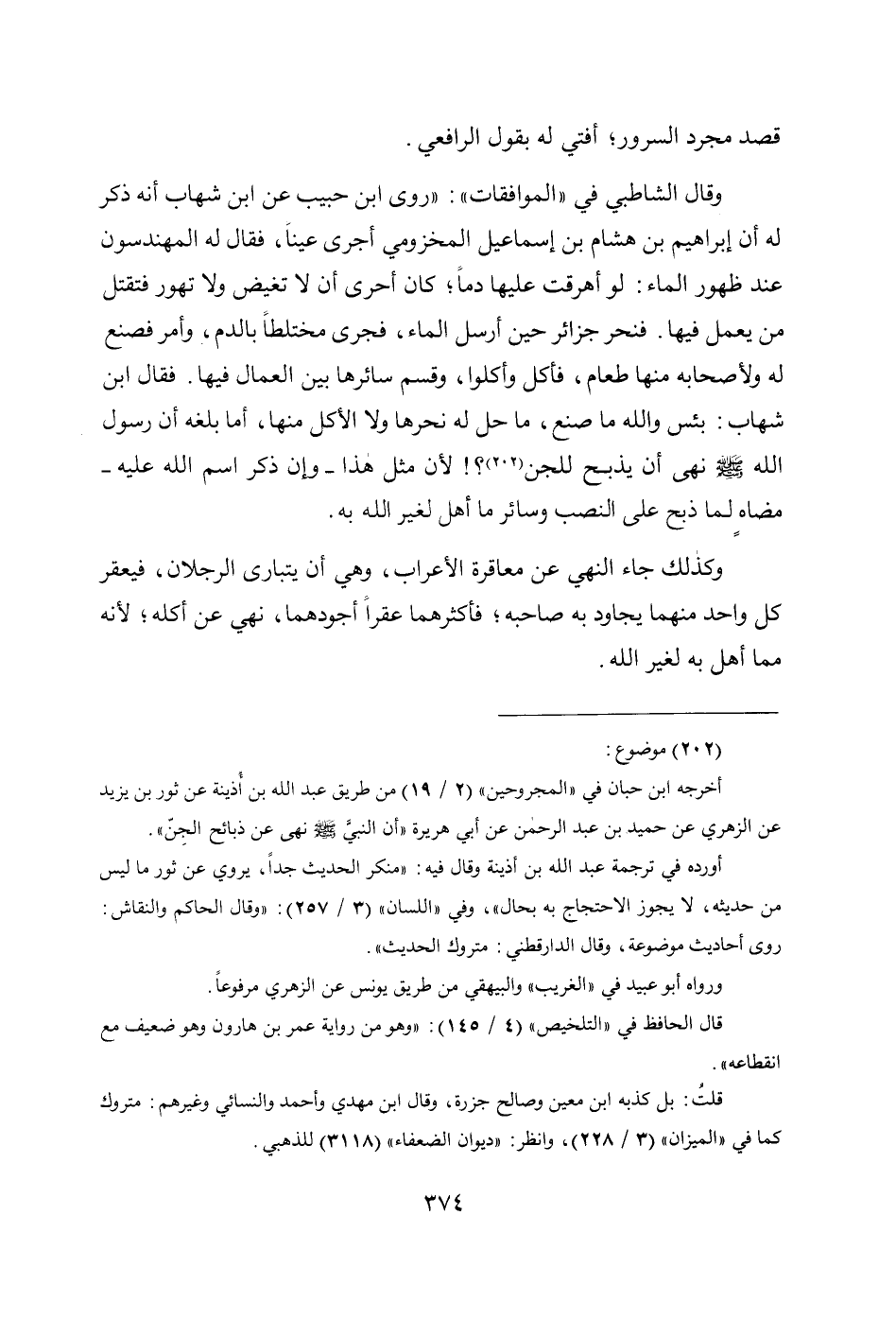 (202) موضوع: أخرجه ابن حبان في " المجروحين " (2/ 19) من طريق عبد الله بن أُذينة عن ثور بن يزيد عن الزهري عن حميد بن عبد الرحمن عن أبي هريرة " أن النبيَّ - صلى الله عليه وسلم - نهى عن ذبائح الجِنّ ".