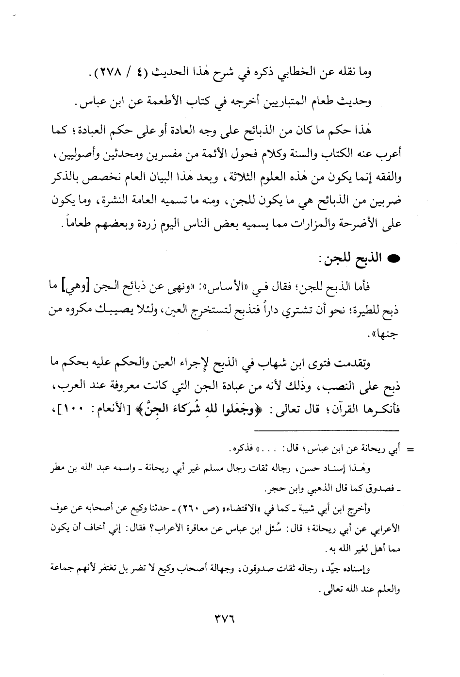 هذا حكم ما كان من الذبائح على وجه العادة أو على حكم العبادة، كما أعرب عنه الكتاب والسنة وكلام فحول الأئمة من مفسرين ومحدثين وأصوليين، والفقه إنما يكون من هذه العلوم الثلاثة، وبعد هذا البيان العام نخصص بالذكر ضربين من الذبائح هي ما يكون للجن، ومنه ما تسميه العامة النشرة، وما يكون على الأضرحة والمزارات مما يسميه بعض الناس اليوم زردة وبعضهم طعاماً.