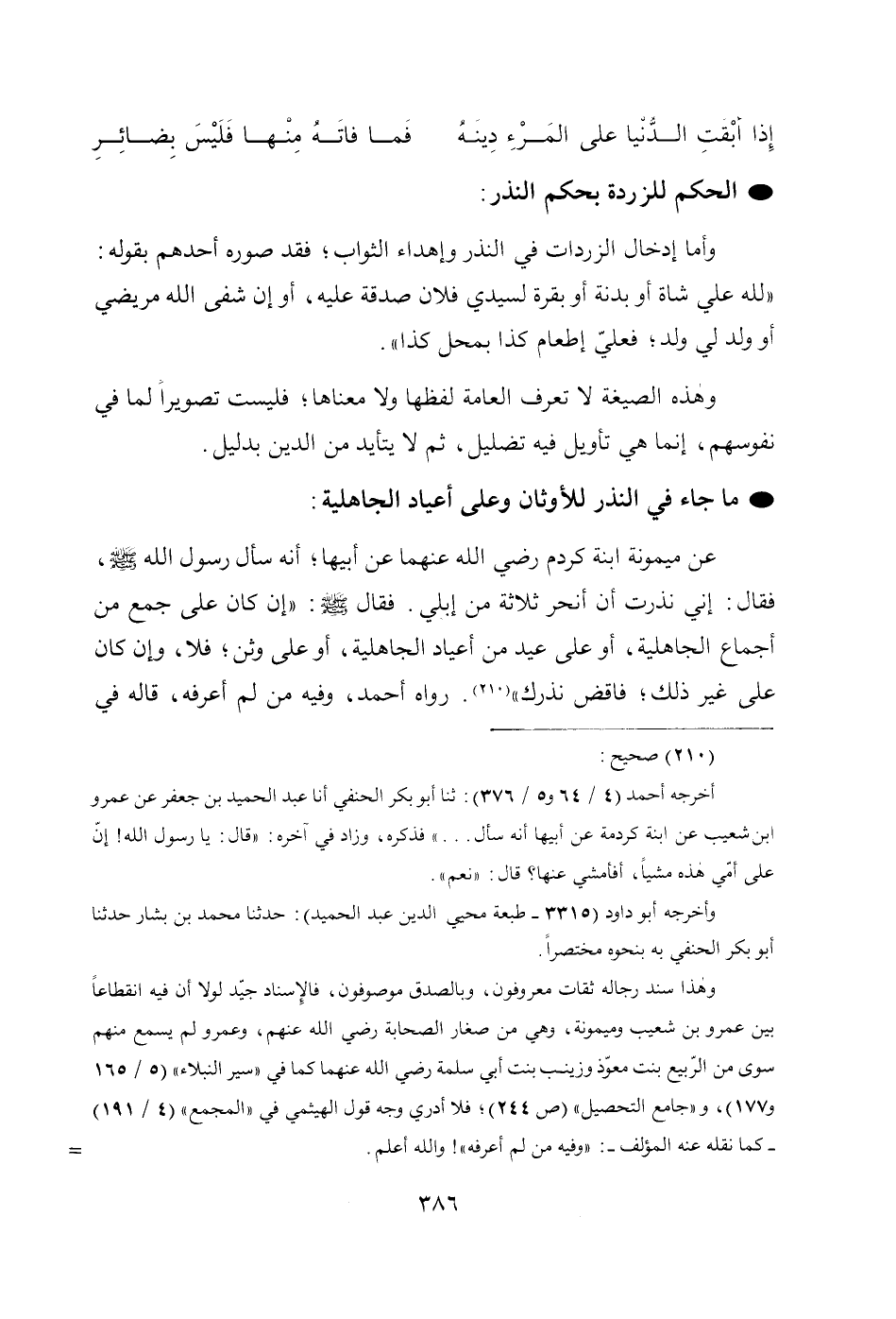 عن ميمونة ابنة كردم رضي الله عنهما عن أبيها، أَنَّهُ سَأَلَ رَسُولَ اللَّهِ - صَلَّى اللهُ عَلَيْهِ وَسَلَّمَ -، فَقَالَ: إِنِّي نَذَرْتُ أَنْ أَنْحَرَ ثَلَاثَةً مِنْ إِبِلِي، فَقَالَ: - صَلَّى اللهُ عَلَيْهِ وَسَلَّمَ -: «إِنْ كَانَ عَلَى جَمْعٍ مِنْ إِجْمَاعِ الْجَاهِلِيَّةِ أَوْ عَلَى عِيدٍ مِنْ أَعْيَادِ الْجَاهِلِيَّةِ أَوْ عَلَى وَثَنٍ فَلَا. وَإِنْ كَانَ عَلَى غَيْرِ ذَلِكَ فَاقْضِ نَذْرَكَ» (210). رواه أحمد، وفيه من لم أعرفه، قاله في