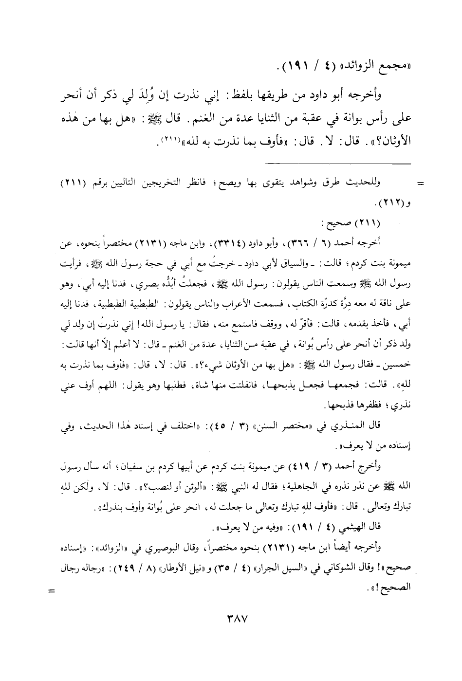 (211) صحيح: أخرجه أحمد (6/ 366)، وأبو داود (3314)، وابن ماجه (2131) مختصراً بنحوه، عن ميمونة بنت كردم؛ قَالَتْ:- والسياق لأبي داود- خَرَجْتُ مَعَ أَبِي فِي حِجَّةِ رَسُولِ اللَّهِ - صَلَّى اللهُ عَلَيْهِ وَسَلَّمَ -، فَرَأَيْتُ رَسُولَ اللَّهِ - صَلَّى اللهُ عَلَيْهِ وَسَلَّمَ - وَسَمِعْتُ النَّاسَ يَقُولُونَ: رَسُولُ اللَّهِ - صَلَّى اللهُ عَلَيْهِ وَسَلَّمَ -، فَجَعَلْتُ أُبِدُّهُ بَصَرِي، فَدَنَا إِلَيْهِ أَبِي، وَهُوَ عَلَى نَاقَةٍ لَهُ مَعَهُ دِرَّةٌ كَدِرَّةِ الْكُتَّابِ، فَسَمِعْتُ الْأَعْرَابَ وَالنَّاسَ يَقُولُونَ: الطَّبْطَبِيَّةَ الطَّبْطَبِيَّةَ، فَدَنَا إِلَيْهِ أَبِي، فَأَخَذَ بِقَدَمِهِ، قَالَتْ: فَأَقَرَّ لَهُ، وَوَقَفَ فَاسْتَمَعَ مِنْهُ، فَقَالَ: يَا رَسُولَ اللَّهِ! إِنِّي نَذَرْتُ إِنْ وُلِدَ لِي وَلَدٌ ذَكَرٌ أَنْ أَنْحَرَ عَلَى رَأْسِ بُوَانَةَ، فِي عَقَبَةٍ مِنَ الثَّنَايَا، عِدَّةً مِنَ الْغَنَمِ- قَالَ: لَا أَعْلَمُ إِلَّا أَنَّهَا قَالَتْ: خَمْسِينَ- فَقَالَ رَسُولُ اللَّهِ - صَلَّى اللهُ عَلَيْهِ وَسَلَّمَ -: «هَلْ بِهَا مِنَ الأَوْثَانِ شَيْءٌ؟». قَالَ: لَا، قَالَ: «فَأَوْفِ بِمَا نَذَرْتَ بِهِ لِلَّهِ» قَالَتْ: فَجَمَعَهَا فَجَعَلَ يَذْبَحُهَا، فَانْفَلَتَتْ مِنْهَا شَاةٌ، فَطَلَبَهَا وَهُوَ يَقُولُ: اللَّهُمَّ أَوْفِ عَنِّي نَذْرِي؛ فَظَفِرَهَا فَذَبَحَهَا.