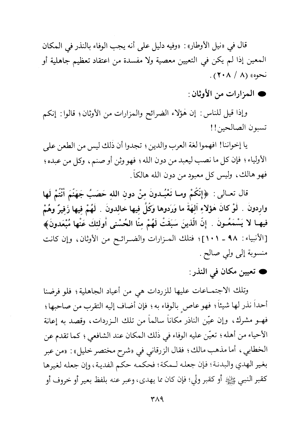 قال تعالى: {إِنَّكُمْ وَمَا تَعْبُدُونَ مِنْ دُونِ اللَّهِ حَصَبُ جَهَنَّمَ أَنْتُمْ لَهَا وَارِدُونَ * لَوْ كَانَ هَؤُلَاءِ آلِهَةً مَا وَرَدُوهَا وَكُلٌّ فِيهَا خَالِدُونَ * لَهُمْ فِيهَا زَفِيرٌ وَهُمْ فِيهَا لَا يَسْمَعُونَ * إِنَّ الَّذِينَ سَبَقَتْ لَهُمْ مِنَّا الْحُسْنَى أُولَئِكَ عَنْهَا مُبْعَدُونَ} [لأنبياء: 98 - 151]؛ فتلك المزارات والضرائح من الأوثان، وإن كانت منسوبة إلى ولي صالح.