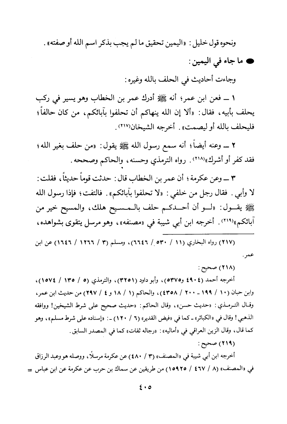 3 - وعن عكرمة، أن عمر بن الخطاب قال: حَدَّثْتُ قَوْمًا حَدِيثًا، فَقُلْتُ: لَا وَأَبِي. فَقَالَ رَجُلٌ مِنْ خَلْفِي: «لَا تَحْلِفُوا بِآبَائِكُمْ» فَالْتَفَتُّ؛ فَإِذَا رَسُولُ اللَّهِ - صَلَّى اللَّهُ عَلَيْهِ وَسَلَّمَ - يَقُولُ: «لَوْ أَنَّ أَحَدَكُمْ حَلَفَ بِالْمَسِيحِ هَلَكَ، وَالْمَسِيحُ خَيْرٌ مِنْ آبَائِكُمْ» (219). أخرجه ابن أبي شيبة في " مصنفه "، وهو مرسل يتقوى بشواهده،