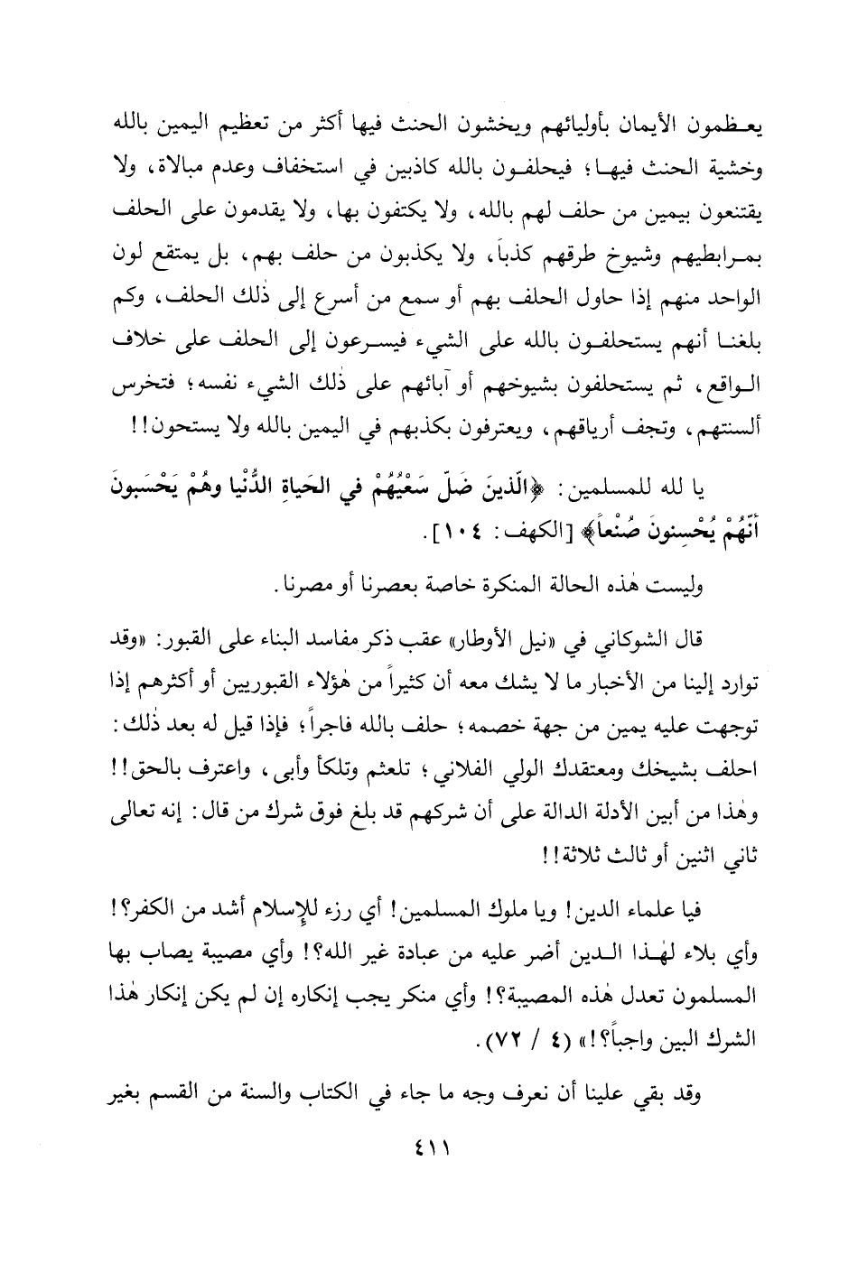 قال الشوكاني في " نيل الأوطار " عقب ذكر مفاسد البناء على القبور: " وقد توارد إلينا من الأخبار ما لا يشك معه أن كثيراً من هؤلاء القبوريين أو أكثرهم إذا توجهت عليه يمين من جهة خصمه؛ حلف بالله فاجراً؛ فإذا قيل له بعد ذلك: احلف بشيخك ومعتقدك الولي الفلاني؛ تلعثم وتلكأ وأبى، واعترف بالحق!! وهذا من أبين الأدلة الدالة على أن شركهم قد بلغ فوق شرك من قال: إنه تعالى ثاني اثنين أو ثالث ثلاثة!!