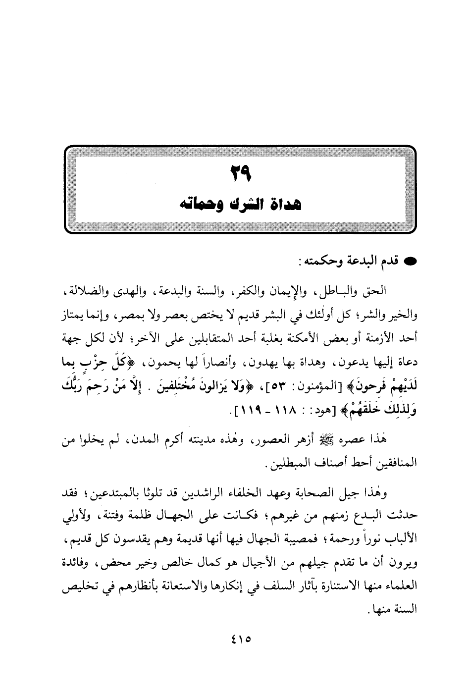الحق والباطل، والإِيمان والكفر، والسنة والبدعة، والهدى والضلالة، والخير والشر؛ كل أولئك في البشر قديم لا يختص بعصر ولا بمصر، وإنما يمتاز أحد الأزمنة أو بعض الأمكنة بغلبة أحد المتقابلين على الآخر؛ لأن لكل جهة دعاة إليها يدعون، وهداة بها يهدون، وأنصاراً لها يحمون، {كُلُّ حِزْبٍ بِمَا لَدَيْهِمْ فَرِحُونَ} [المؤمنون: 53]، {وَلَا يَزَالُونَ مُخْتَلِفِينَ * إِلَّا مَنْ رَحِمَ رَبُّكَ وَلِذَلِكَ خَلَقَهُمْ} [هود:: 118 - 119].