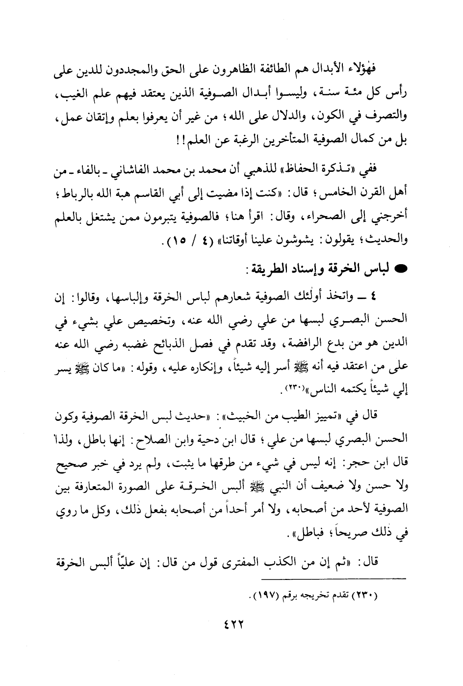 4 - واتخذ أولئك الصوفية شعارهم لباس الخرقة وإلباسها، وقالوا: إن الحسن البصري لبسها من علي رضي الله عنه، وتخصيص علي بشيء في الدين هو من بدع الرافضة، وقد تقدم في فصل الذبائح غضبه رضي الله عنه على من اعتقد فيه أنه - صَلَّى اللهُ عَلَيْهِ وَسَلَّمَ - أسر إليه شيئاً، وإنكاره عليه، وقوله: " مَا كَانَ - صَلَّى اللهُ عَلَيْهِ وَسَلَّمَ - يُسِرُّ إِلَيَّ شَيْئًا يَكْتُمُهُ النَّاسَ" (230).