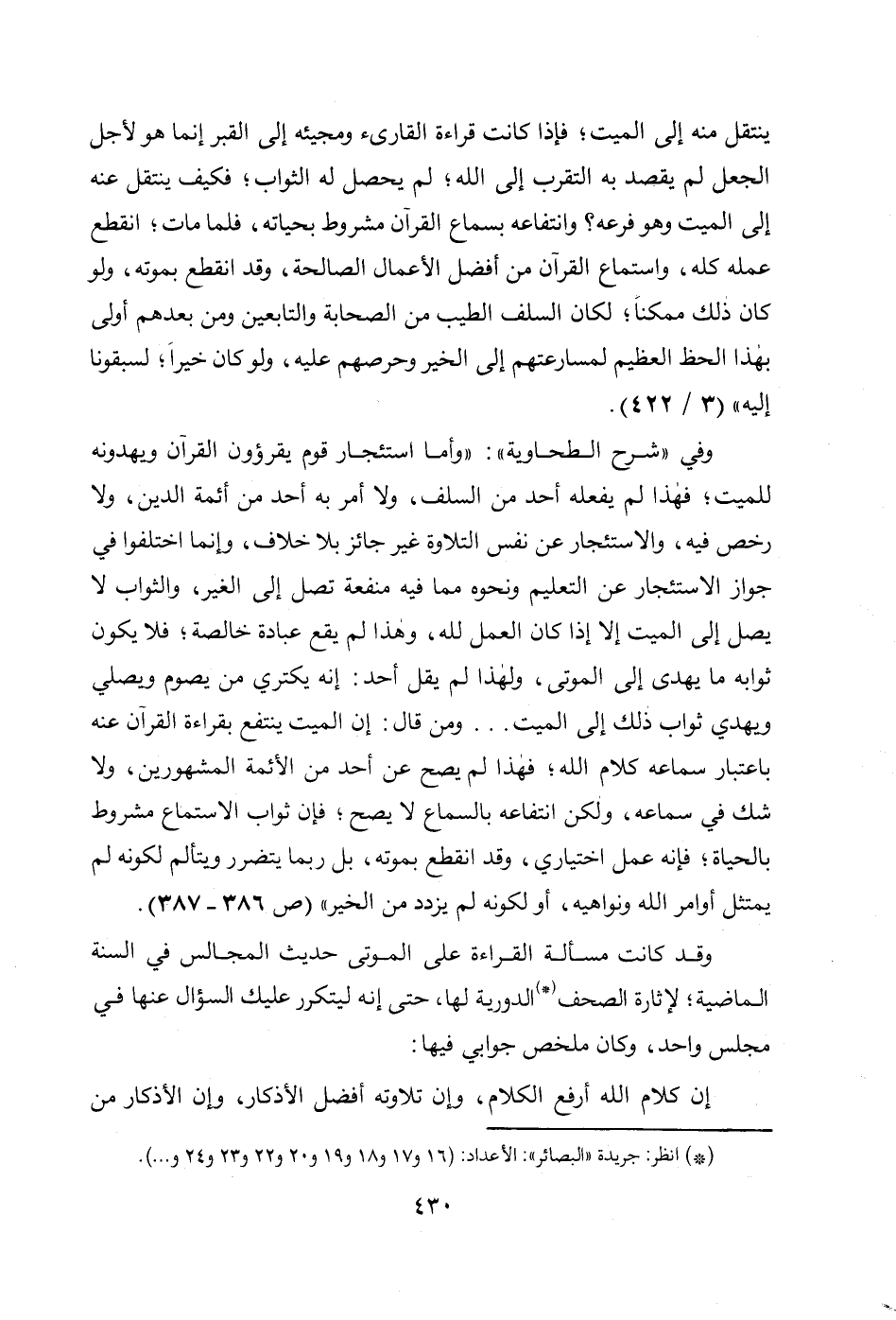 وقد كانت مسألة القراءة على الموتى حديث المجالس في السنة الماضية؛ لإثارة الصحف (*) الدورية لها، حتى إنه ليتكرر عليك السؤال عنها في مجلس واحد، وكان ملخص جوابي فيها: