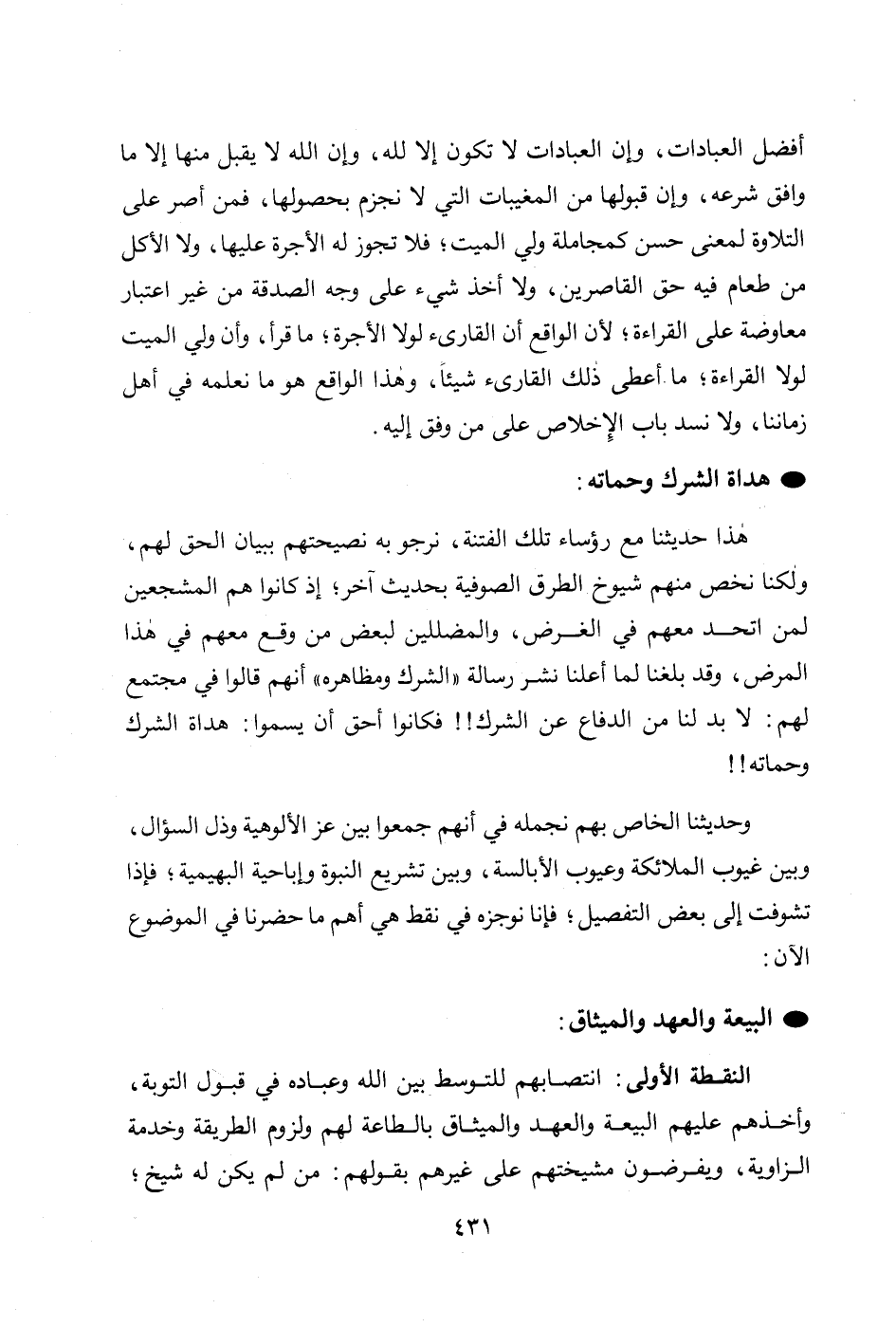 هذا حديثنا مع رؤساء تلك الفتنة، نرجو به نصيحتهم ببيان الحق لهم، ولكنا نخص منهم شيوخ الطرق الصوفية بحديث آخر؛ إذ كانوا هم المشجعين لمن اتحد معهم في الغرض، والمضللين لبعض من وقع معهم في هذا المرض، وقد بلغنا لما أعلنا نشر رسالة ـ[الشرك ومظاهره]ـ أنهم قالوا في مجتمع لهم: لا بد لنا من الدفاع عن الشرك!! فكانوا أحق أن يسموا: هداة الشرك وحماته!!