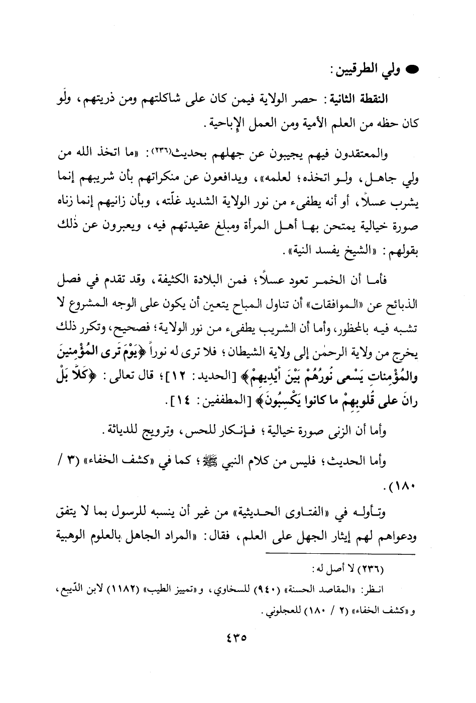 فأما أن الخمر تعود عسلًا، فمن البلادة الكثيفة، وقد تقدم في فصل الذبائح عن " الموافقات " أن تناول المباح يتعين أن يكون على الوجه المشروع لا تشبه فيه بالمحظور، وأما أن الشريب يطفئ من نور الولاية؛ فصحيح، وتكرر ذلك يخرج من ولاية الرحمن إلى ولاية الشيطان؛ فلا ترى له نوراً {يَوْمَ تَرَى الْمُؤْمِنِينَ وَالْمُؤْمِنَاتِ يَسْعَى نُورُهُمْ بَيْنَ أَيْدِيهِمْ} [الحديد: 12]، قال تعالى: {كَلَّا بَلْ رَانَ عَلَى قُلُوبِهِمْ مَا كَانُوا يَكْسِبُونَ} [المطففين: 14].