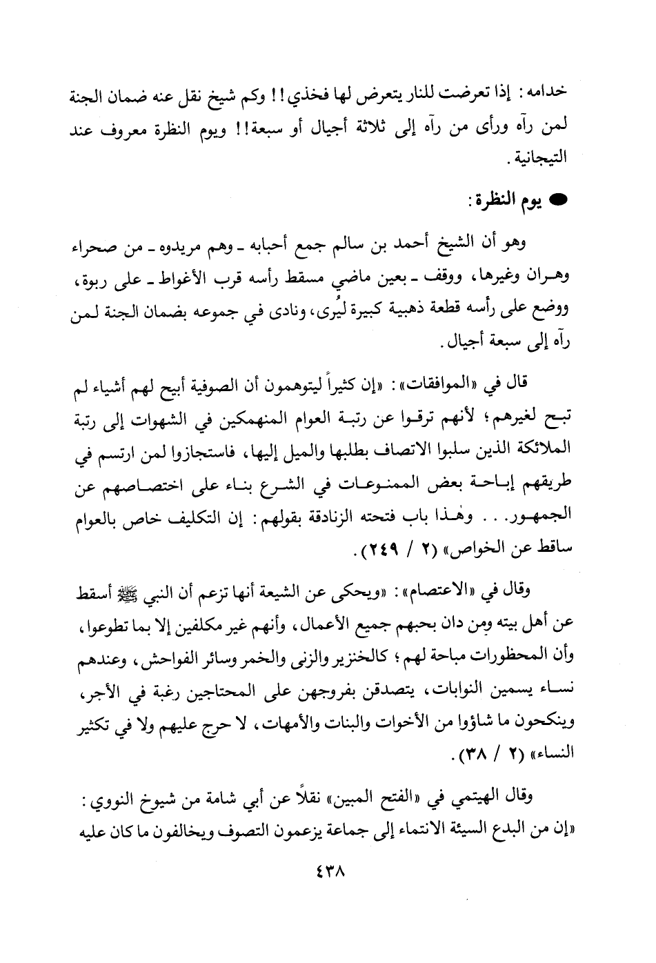خدامه: إذا تعرضت للنار يتعرض لها فخذي!! وكم شيخ نقل عنه ضمان الجنة لمن رآه ورأى من رآه إلى ثلاثة أجيال أو سبعة!! ويوم النظرة معروف عند التيجانية.