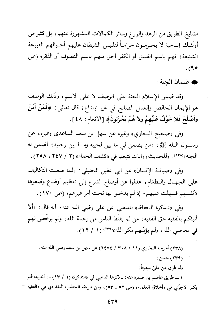 وفي " صحيح البخاري " وغيره عن سهل بن سعد الساعدي وغيره، عن رسول الله - صلى الله عليه وسلم -: «مَنْ يَضْمَنْ لِي مَا بَيْنَ لَحْيَيْهِ وَمَا بَيْنَ رِجْلَيْهِ؛ أَضْمَنْ لَهُ الجَنَّةَ» (238). وللحديث روايات تتبعها في " كشف الخفاء " (2/ 247، 258).