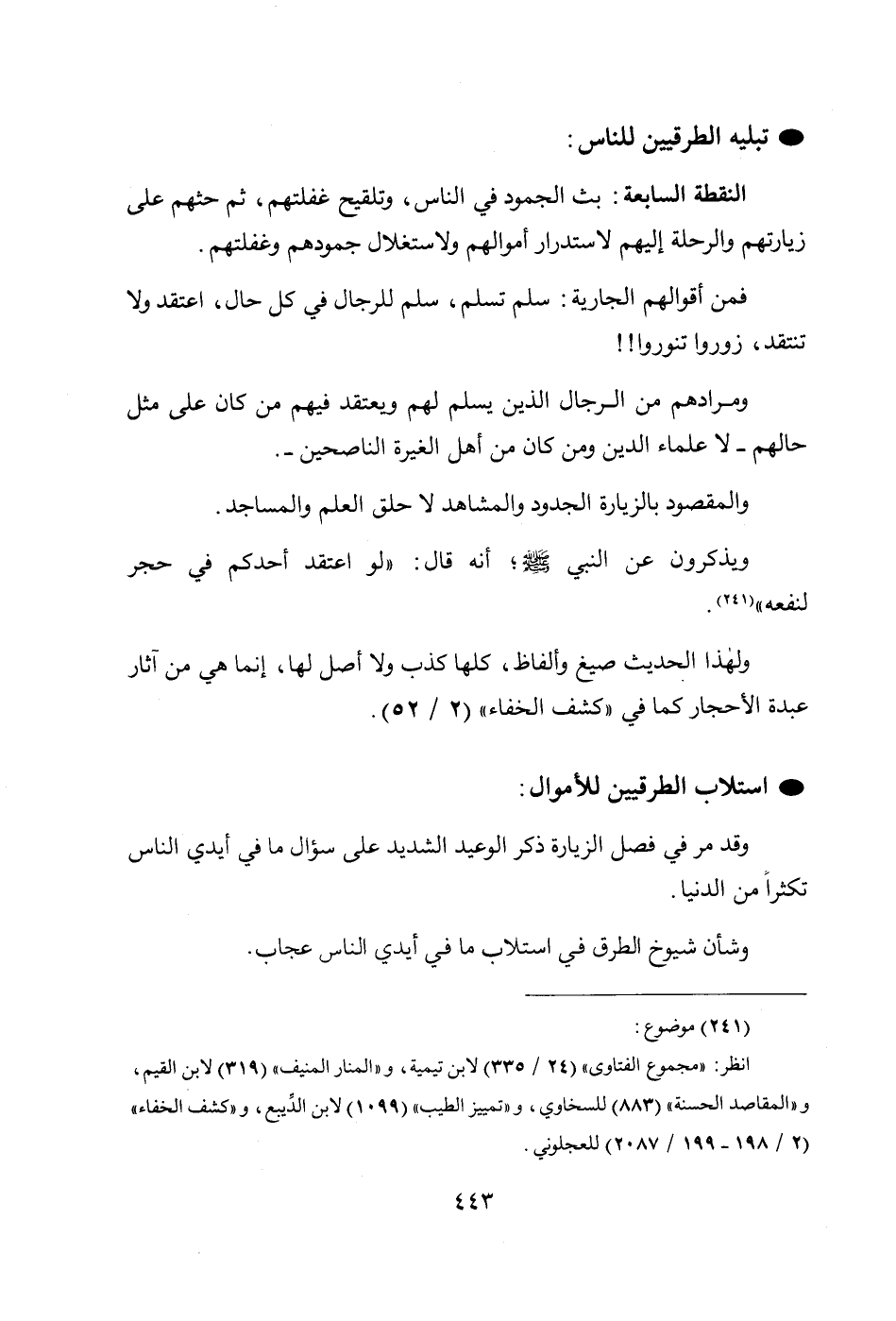 النقطة السابعة: بث الجمود في الناس، وتلقيح غفلتهم، ثم حثهم على زيارتهم والرحلة إليهم لاستدرار أموالهم ولاستغلال جمودهم وغفلتهم.