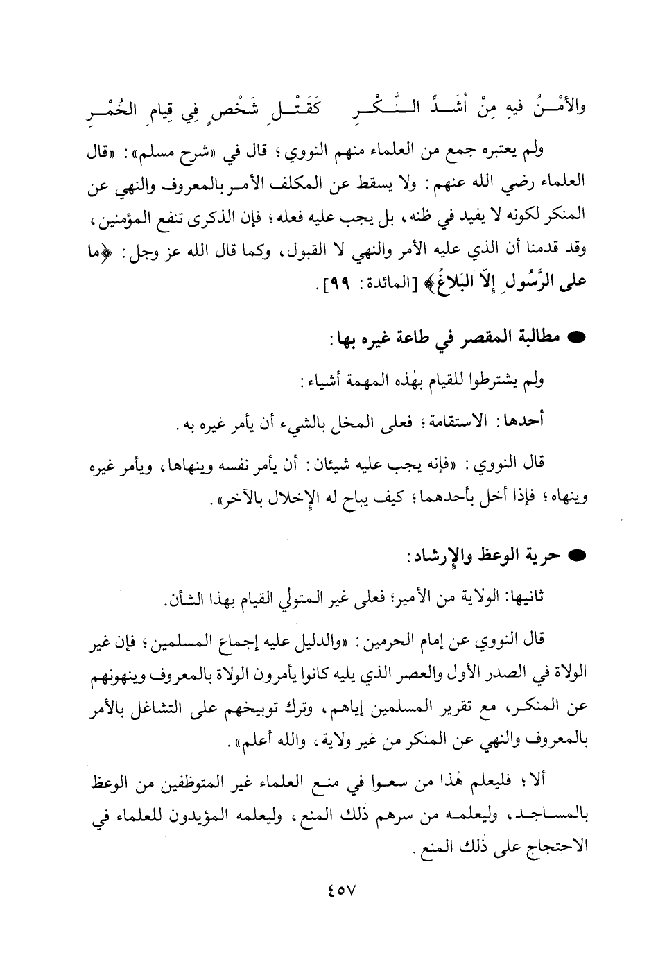 ولم يعتبره جمع من العلماء منهم النووي؛ قال في " شرح مسلم ": " قال العلماء رضي الله عنهم: ولا يسقط عن المكلف الأمر بالمعروف والنهي عن المنكر لكونه لا يفيد في ظنه، بل يجب عليه فعله؛ فإن الذكرى تنفع المؤمنين، وقد قدمنا أن الذي عليه الأمر والنهي لا القبول، وكما قال الله عز وجل: {مَا عَلَى الرَّسُولِ إِلَّا الْبَلَاغُ} [المائدة: 99].